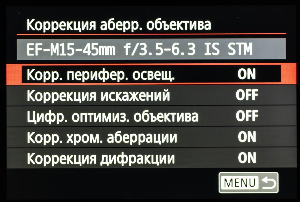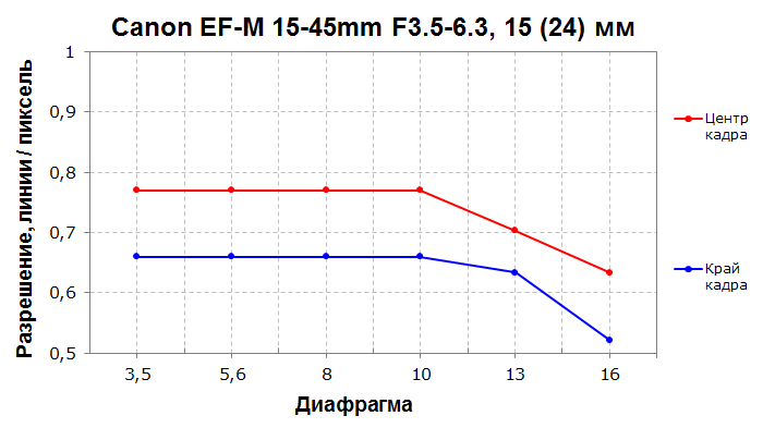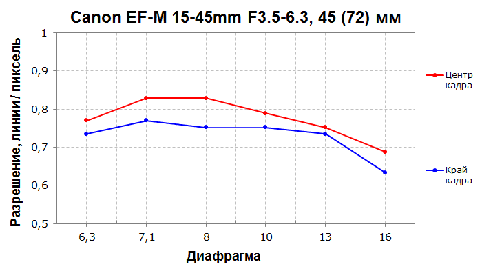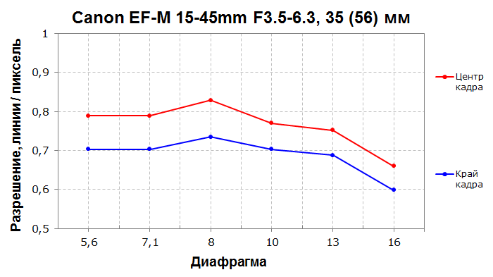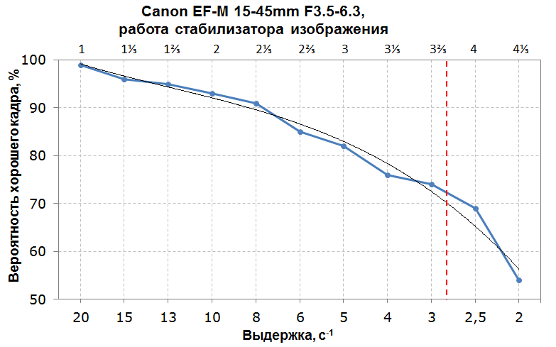 Canon EF-M 15-45mm F3.5-6.3 IS STM оснащен стабилизатором изображения. Производитель заявляет эффективность в 3,5 ступени экспозиции. Наша методика подтверждает почти 4 ступени, так что стабилизатор в объективе весьма эффективный.