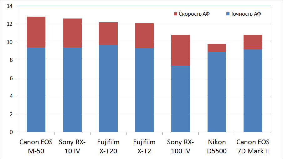 По точности автофокуса Canon EOS M50 находится на уровне самых быстрых «беззеркалок», а по скорости обгоняет зеркальные камеры. Общий балл и вовсе выводит ее на первое место среди приведенных конкурентов.