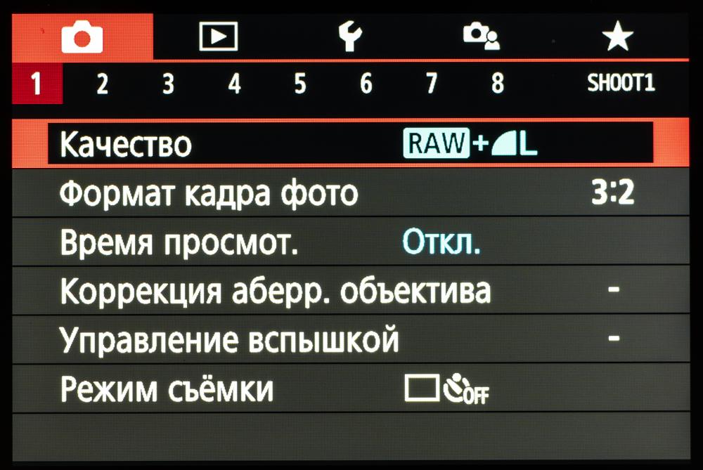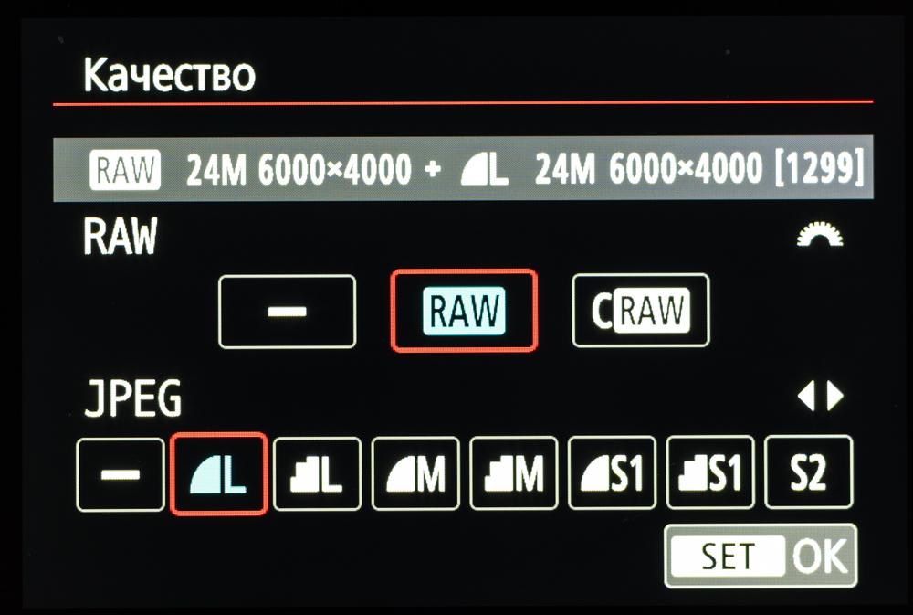 | Формат записи фото | JPEG (Exif 2.31) 3:2: 6000×4000, 3984×2656, 2976×1984, 2400×1600; 4:3: 5328×4000, 3552×2664, 2656×1992, 2112×1600; 16:9: 6000×3368, 3984×2240, 2976×1680, 2400×1344; 1:1: 4000×4000, 2656×2656, 1984×1984, 1600×1600 RAW (14 бит CR3) 3:2: 6000×4000, 4:3: 5328×4000, 16:9: 6000×3368, 1:1: 4000×4000 |