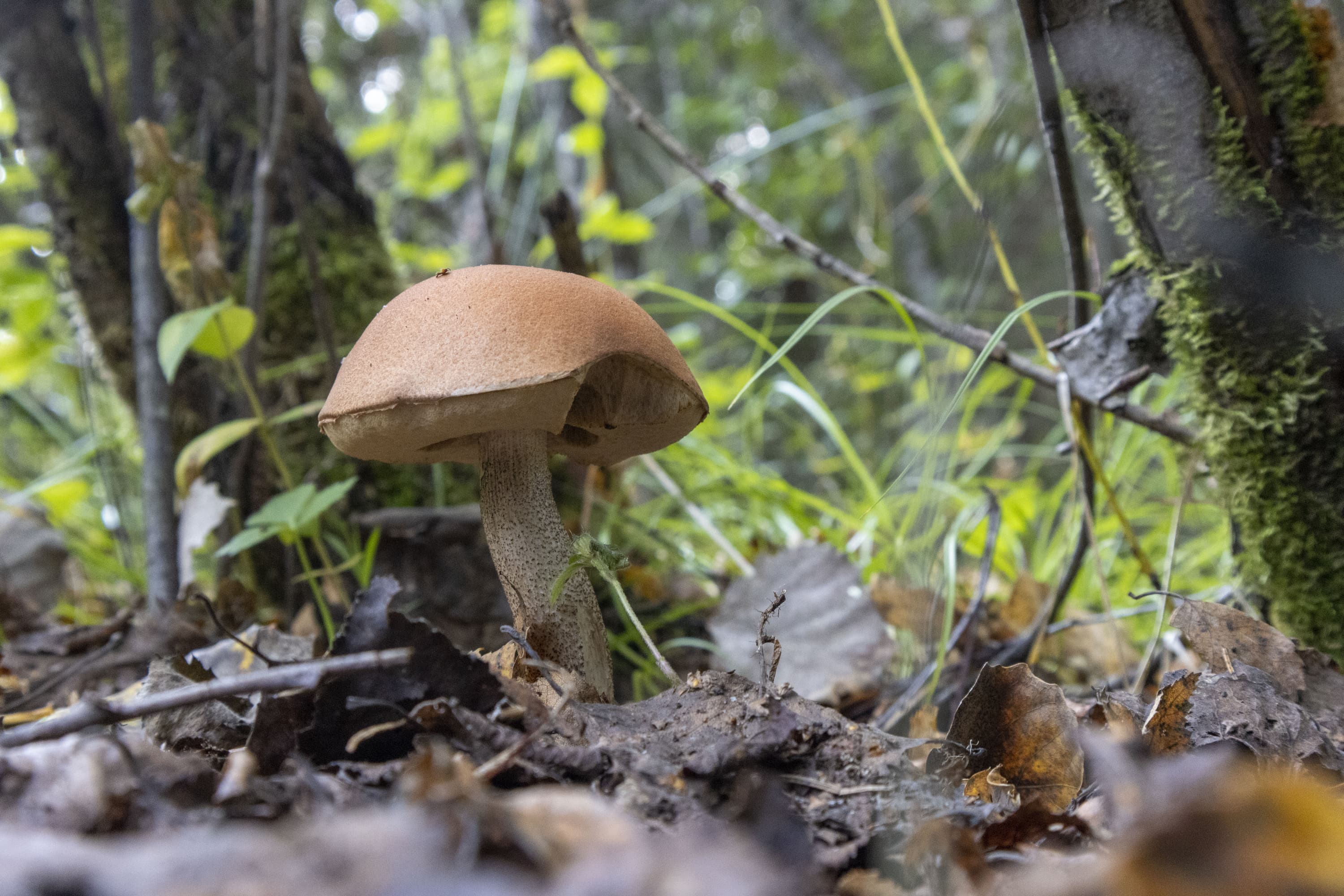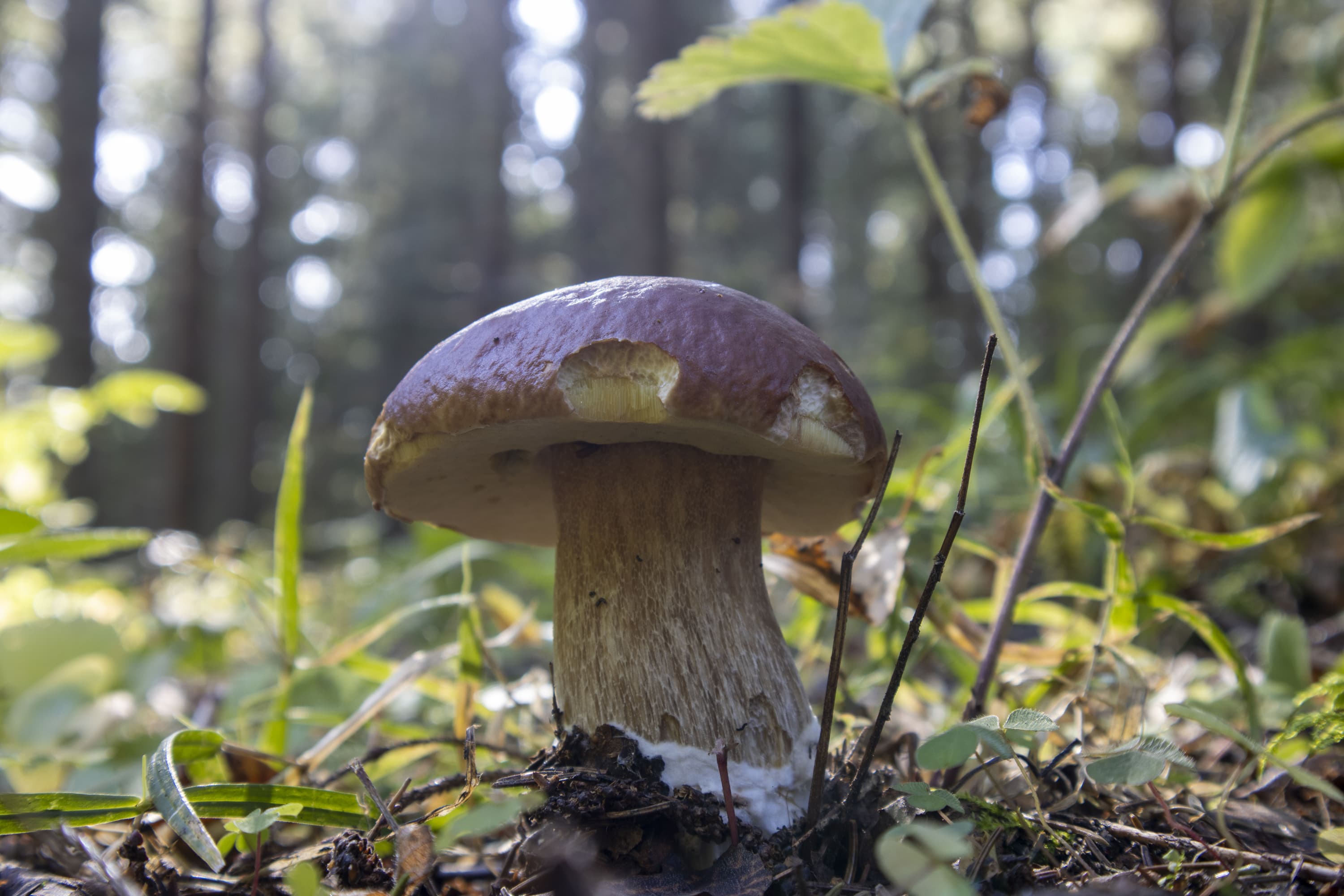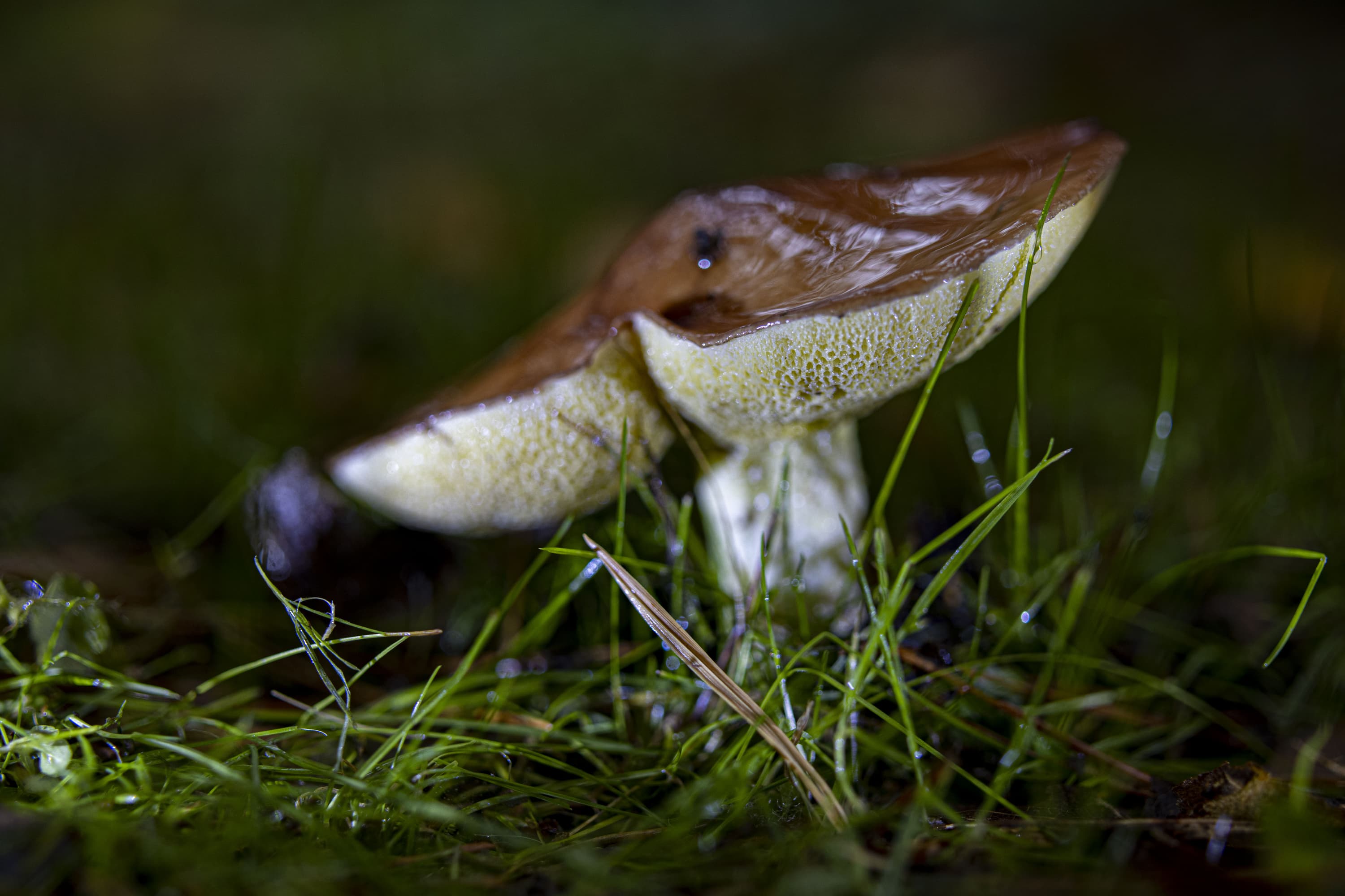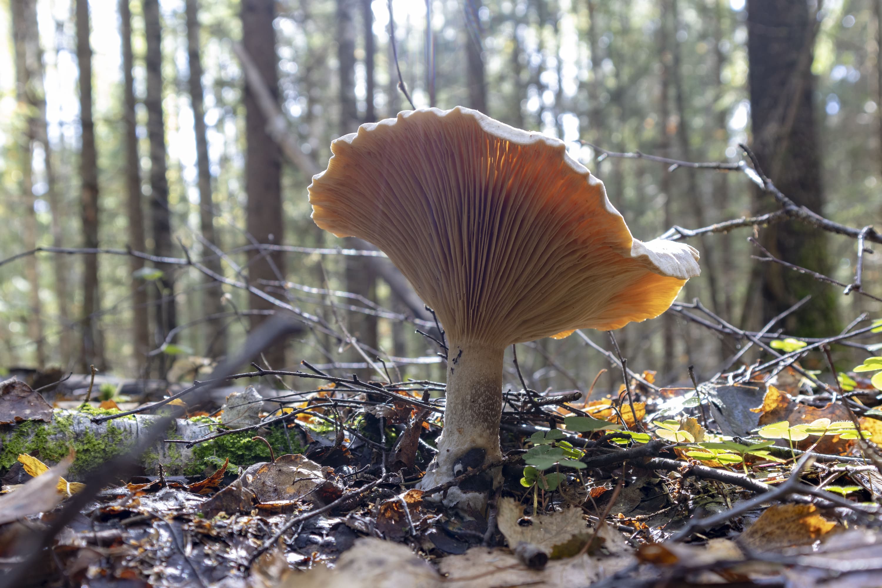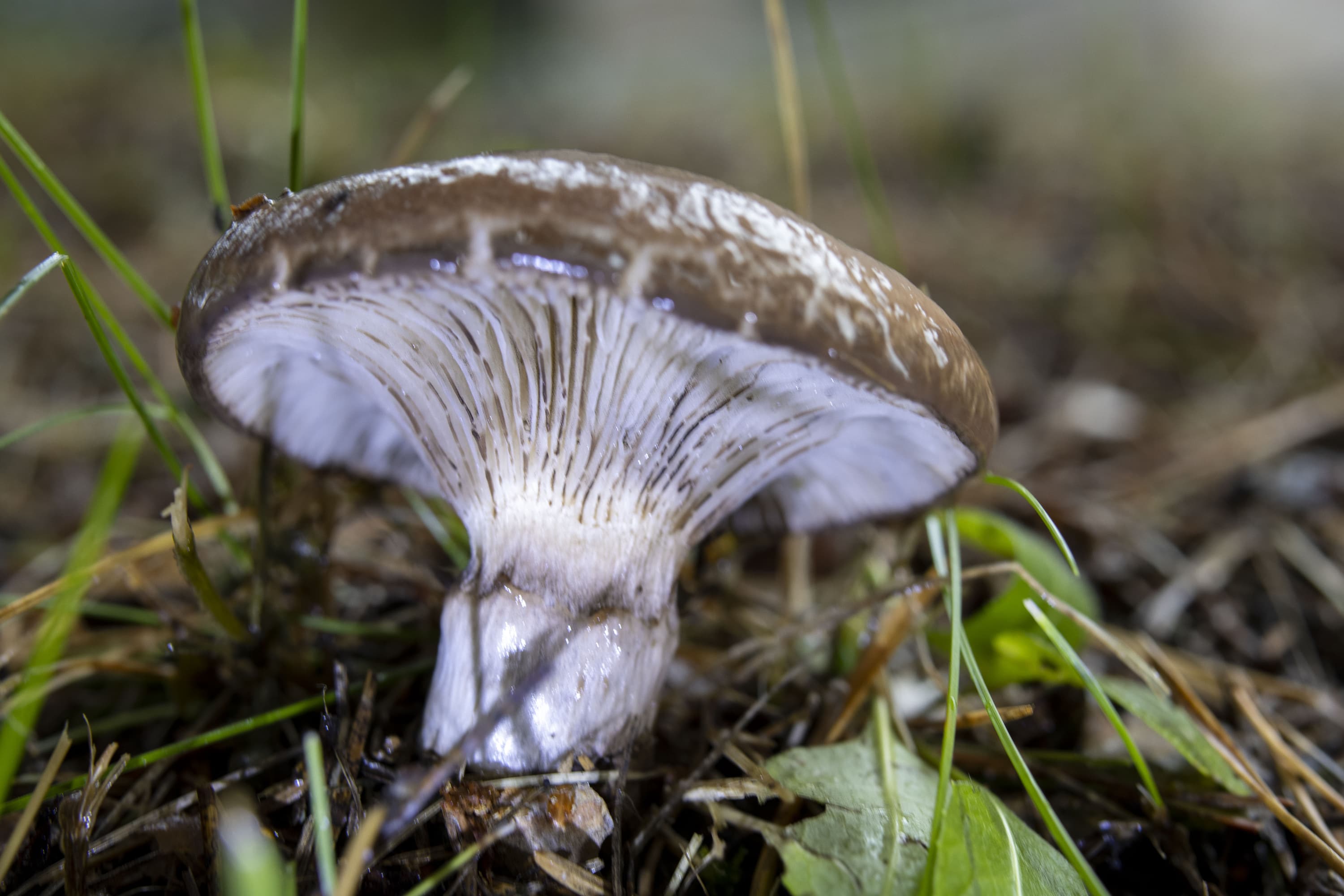 На снимке, приведенном выше, хорошо различимы не только пластинки шляпки гриба, не только ветки и травинки, но даже ворсинки на краях листьев клевера (справа).