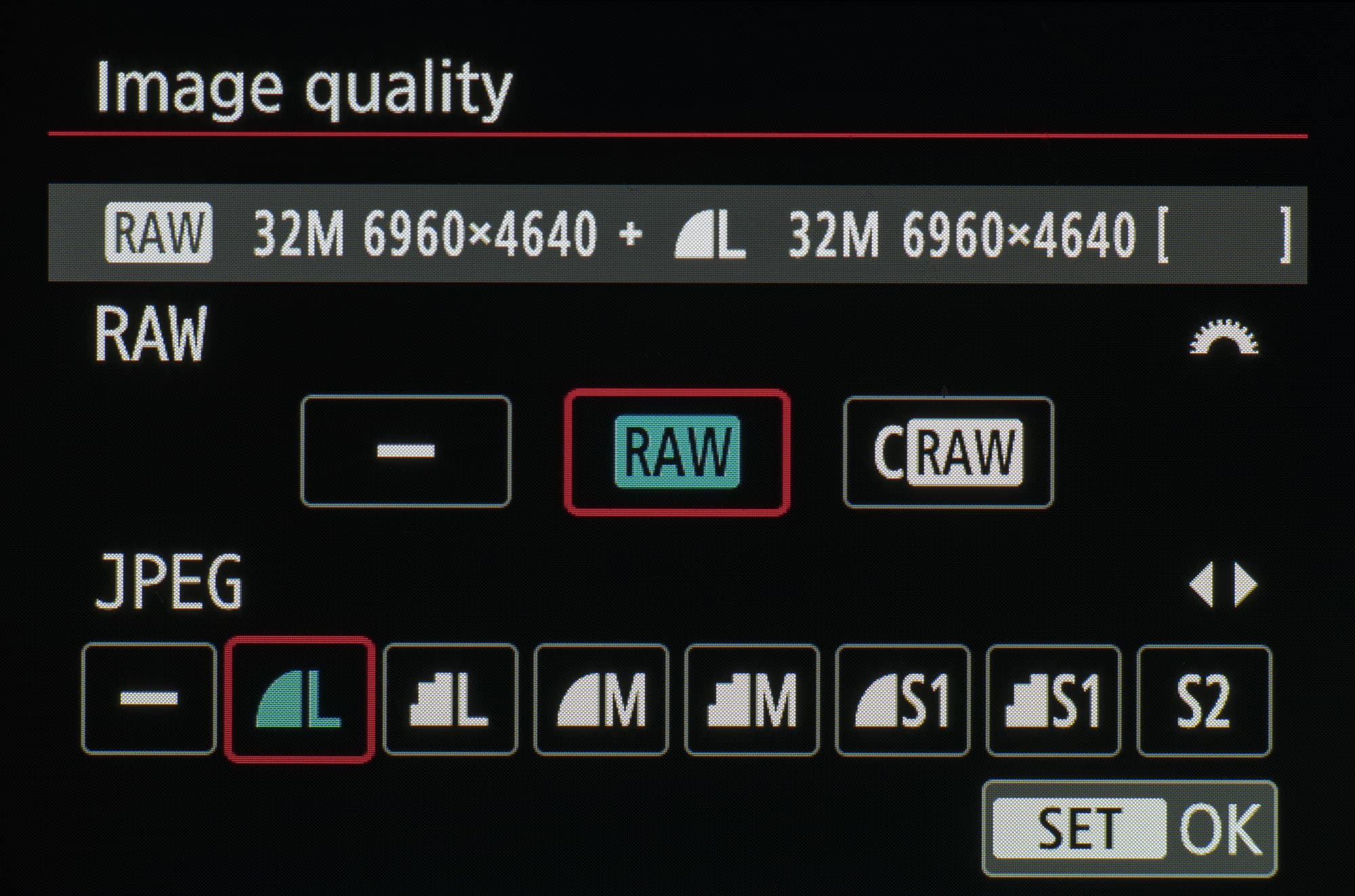 | Формат записи фото | JPEG 3:2 (L) 6960×4640, (M) 4800×3200, (S1) 3472×2320, (S2) 2400×1600 4:3 (L) 6160×4640, (M) 4256×3200 (S1) 3072×2320 (S2) 2112×1600 16:9 (L) 6960×3904, (M) 4800×2688 (S1) 3472×1952 (S2) 2400×1344 1:1 (L) 4640×4640, (M) 3200×3200, (S1) 2300×2300 (S2) 1600×1600 RAW (14 бит CR3): 6960×4640 (3:2), 6160×4640 (4:3), 6960×3904 (16:9), 4640×4640 (1:1) |