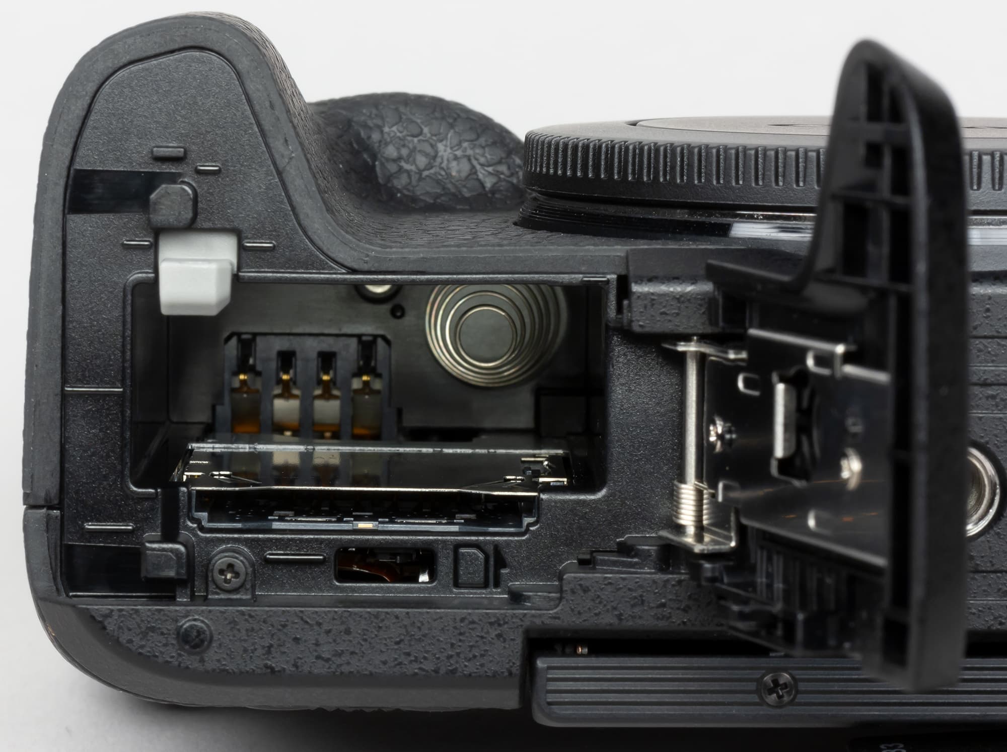 Снизу большую часть занимает крышка отсека для батареи и карты памяти, снабженная замком, и стандартная штативная резьба. При установке на штатив открыть отсек не получится.