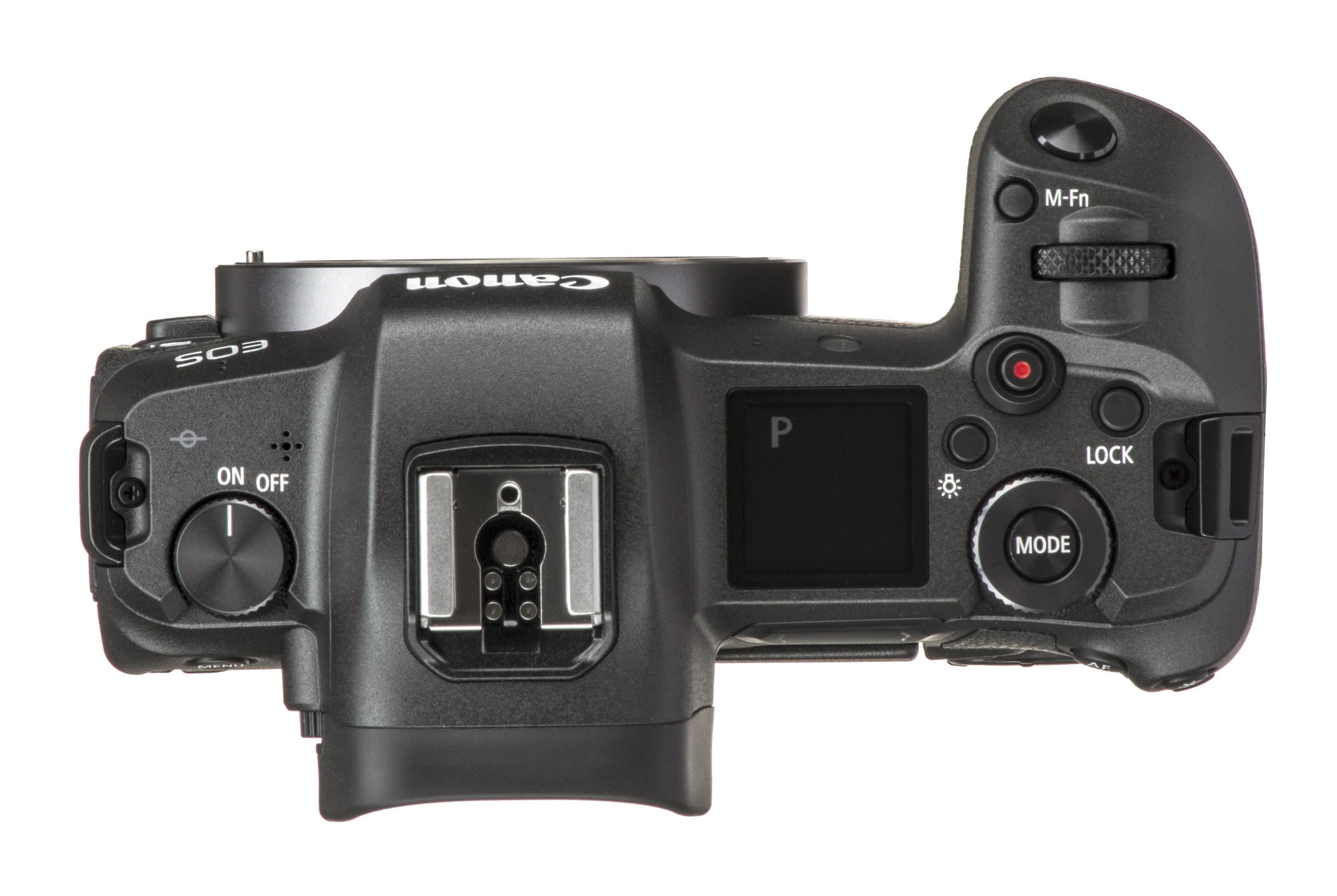 Сверху нет привычного селектора режимов съемки. Слева расположен выключатель питания, который нужно повернуть до щелчка против часовой стрелки. «Горячий башмак» — традиционной конструкции, поддерживает работу со вспышками Canon в режиме E-TTL II. Справа от него установлен информационный дисплей, а далее следуют кнопки подсветки дисплея, активации записи видео, многофункциональная (M-Fn), передний диск управления. Заднее колесо управления снабжено кнопкой в центре, которая позволяет выбирать нужный параметр.