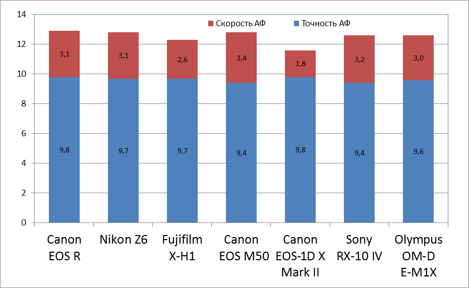 По точности автофокуса камера уверенно забирается в топ нашего рейтинга. Скорость автофокуса у нее чуть ниже, чем у лидера Canon EOS M50, однако в общем зачете EOS R находится на первом месте, практически наравне с Nikon Z6.