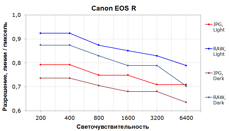 Сенсор показывает высокие результаты как в RAW, так и в JPEG. Разрешающая способность в случае RAW практически не падает ниже 80% во всем диапазоне испытаний, за исключением одной точки на ISO 6400 в темной сцене. На низких значениях светочувствительности в светлой сцене камера и вовсе отрабатывает более 90% сенсора, что для полнокадровых камер редкость. Значения разрешения JPEG в светлой сцене не покидают коридора 70%—80% во всем диапазоне измерений, «темный» JPEG держится чуть ниже, на уровне 70%.
