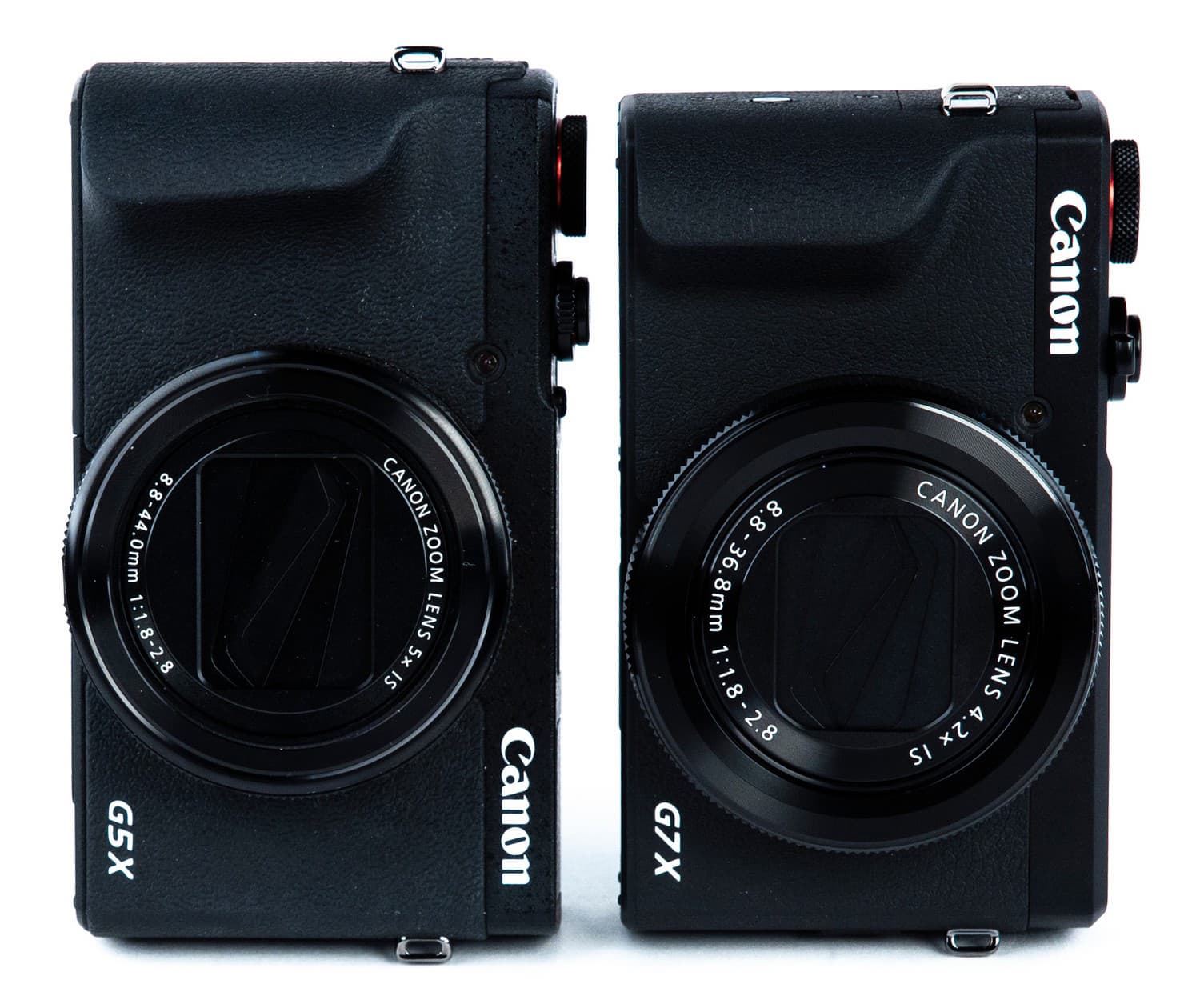 Спереди камеры различить практически нереально, если не смотреть на надписи, хотя видно, что G5 немного больше. Также G5 имеет чуть больший зум, нежели G7. На объективе обеих камер располагается кольцо, которое по умолчанию отвечает за управление диафрагмой, но можно назначить на него и другие функции.