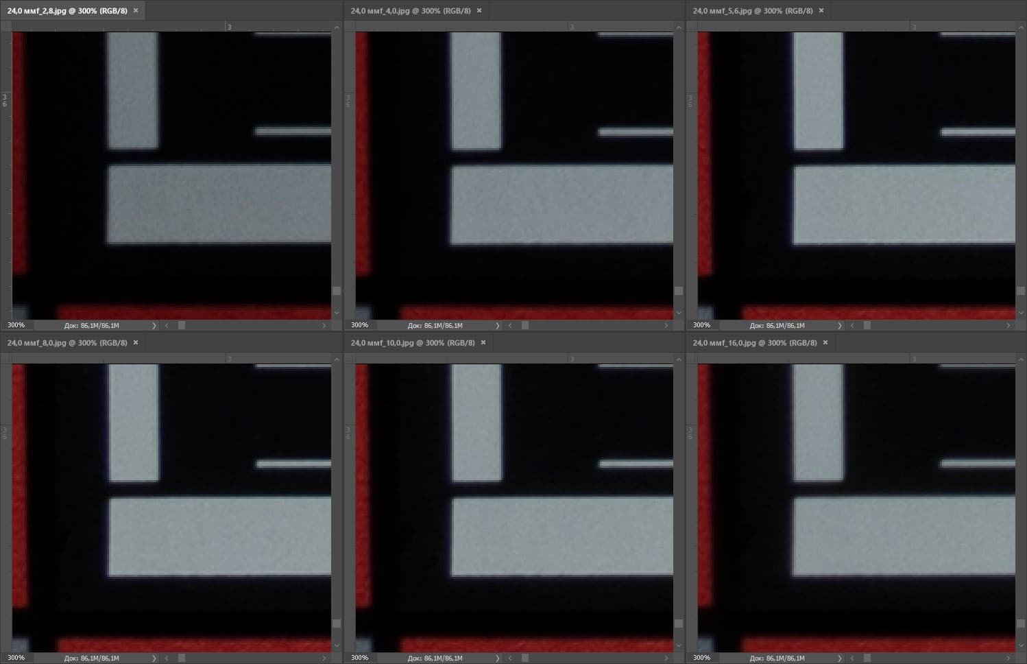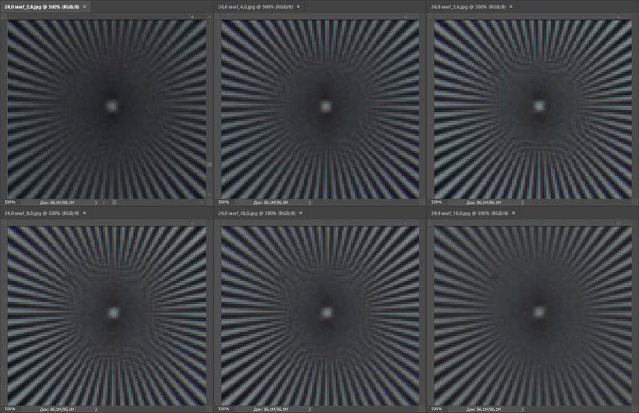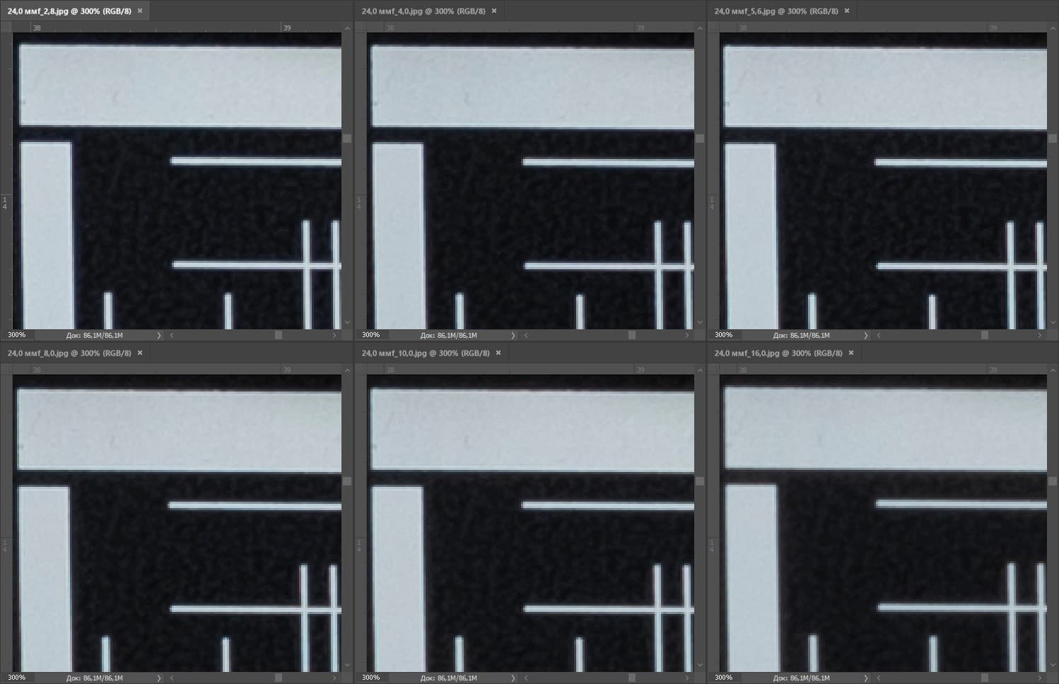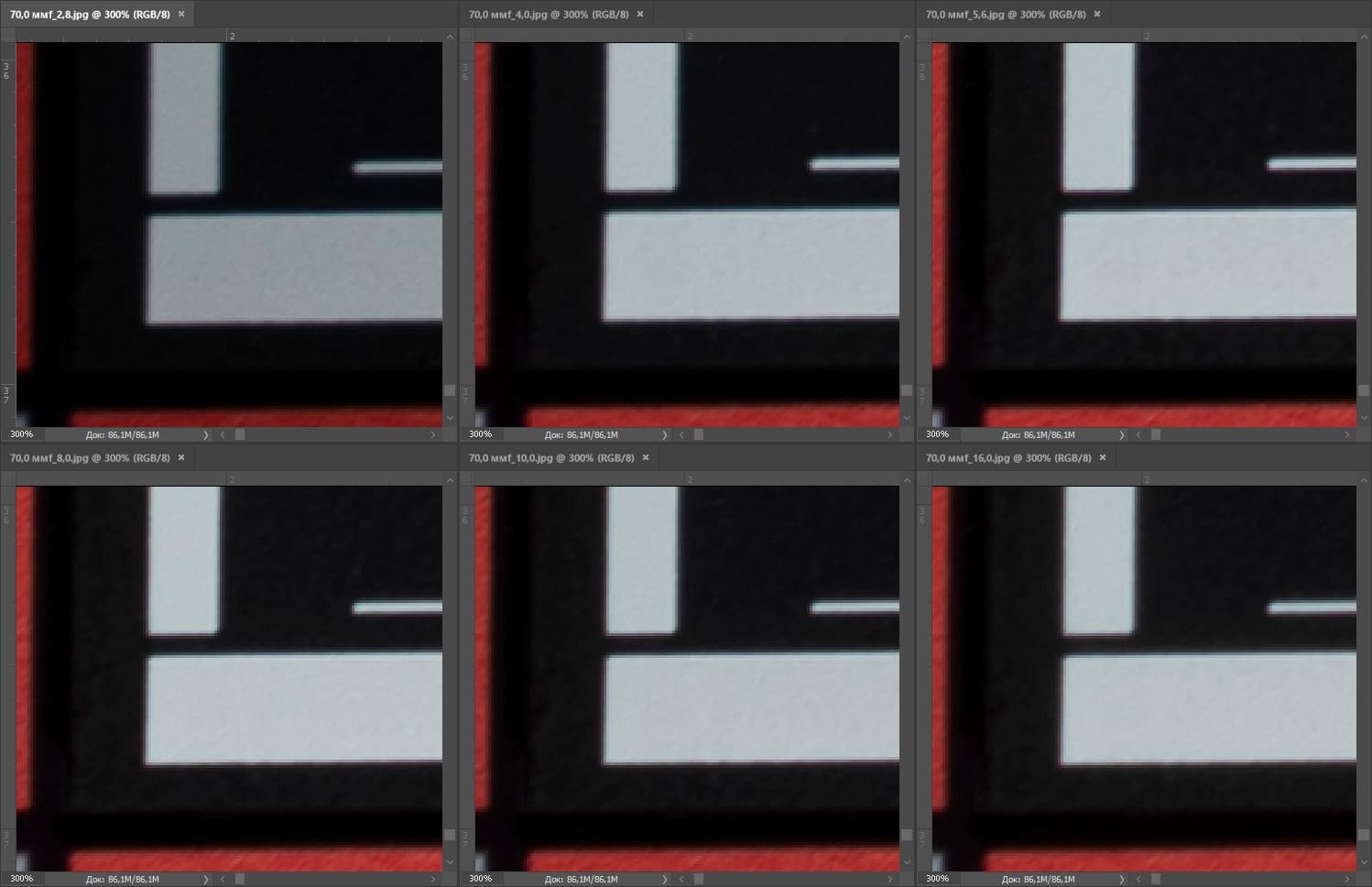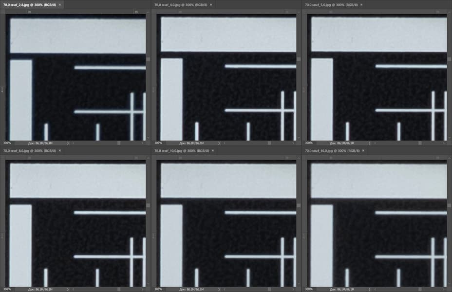 | На всех скриншотах верхний ряд: f/2,8 — f/4,0 — f/5,6, нижний ряд: f/8 — f/10 — f/16 | |||