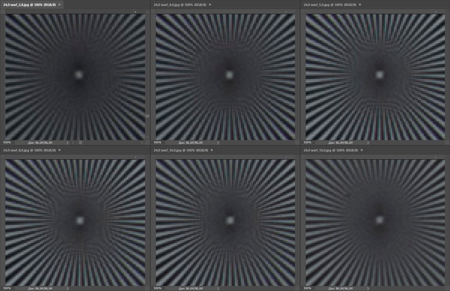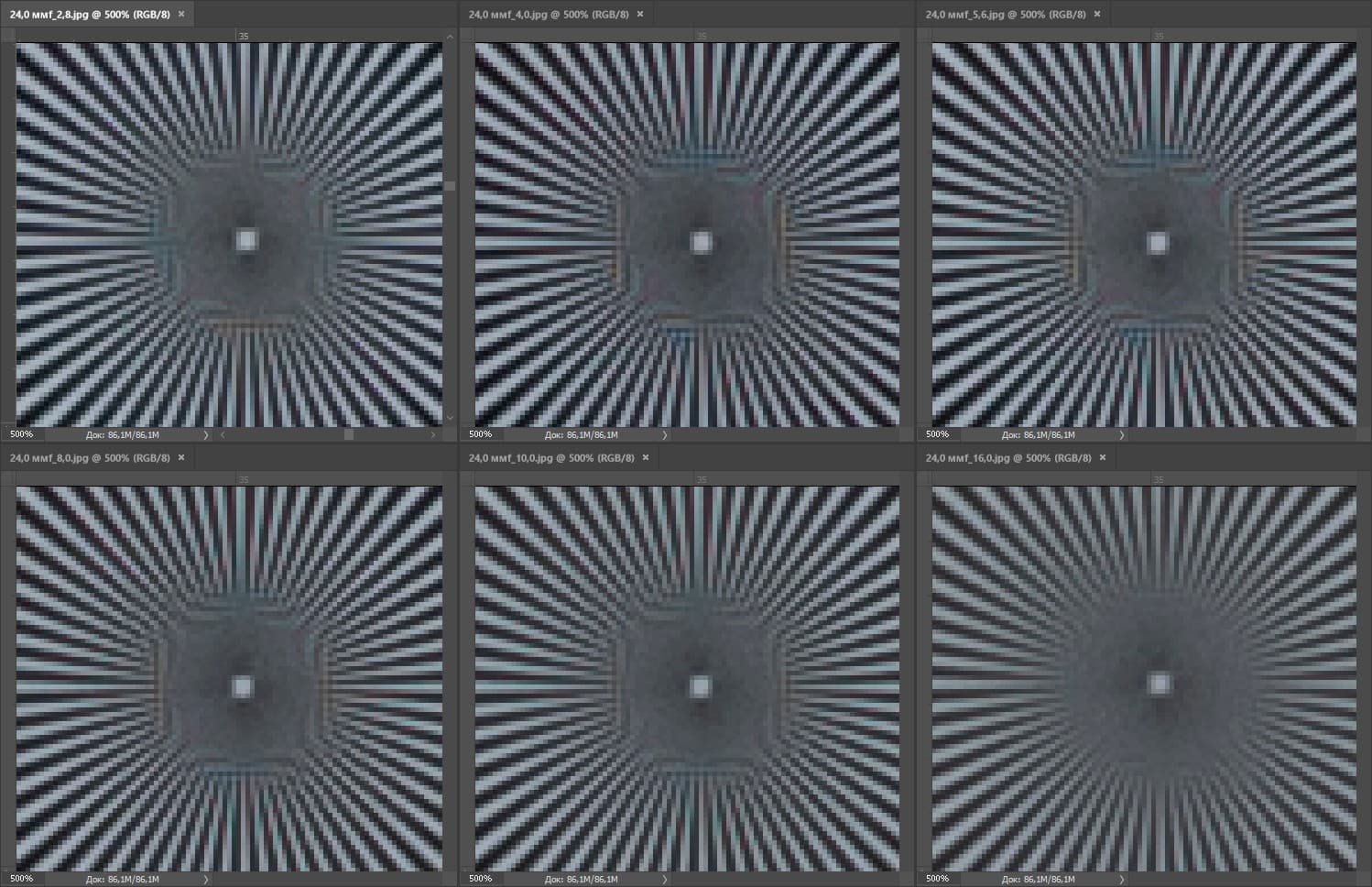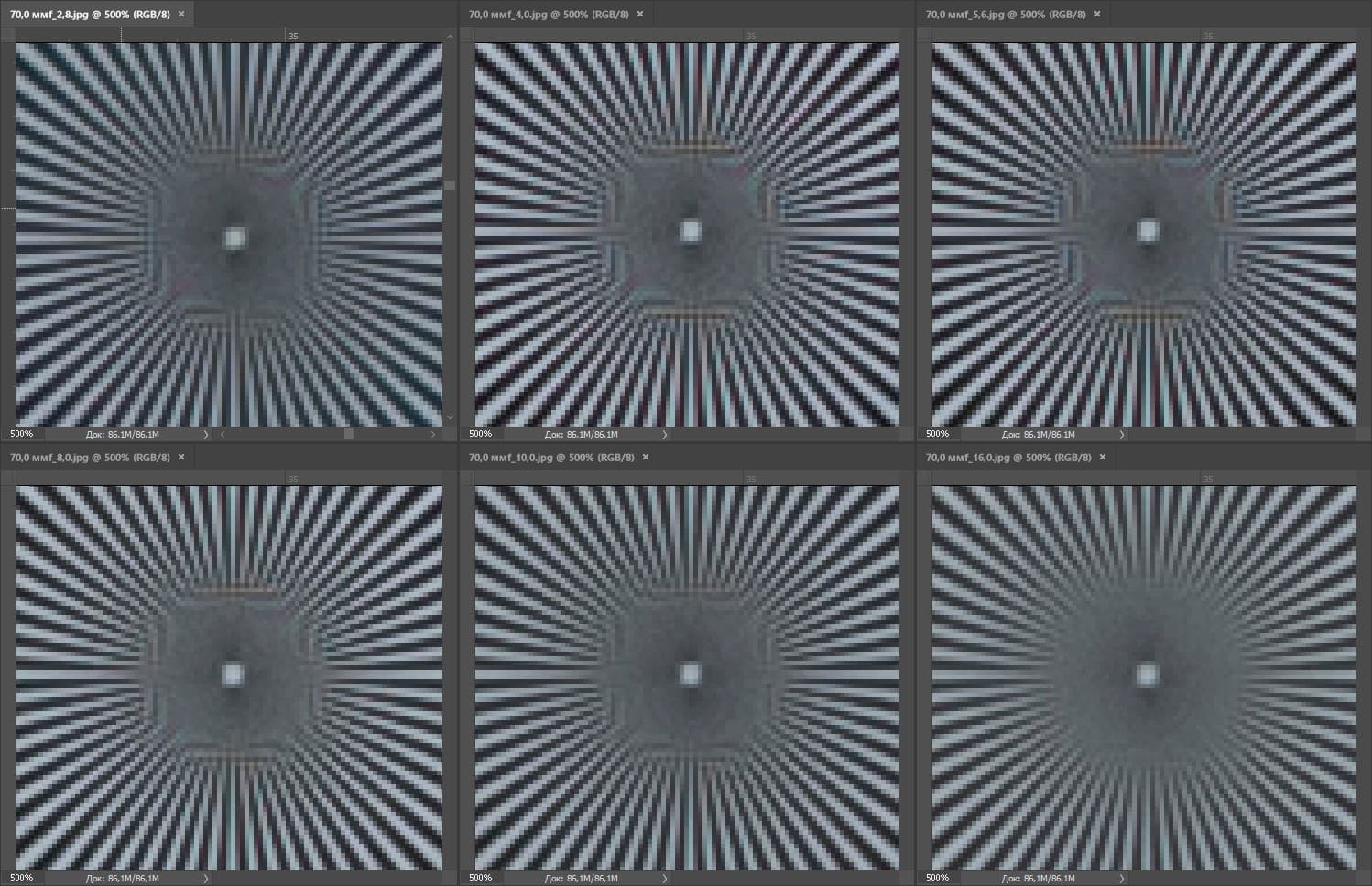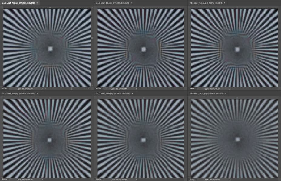 | На всех скриншотах верхний ряд: f/2,8 — f/4,0 — f/5,6, нижний ряд: f/8 — f/10 — f/16 | |||