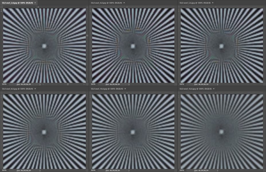 На 50 мм картина та же, лишь с небольшими изменениями. На диафрагме F2,8 центр стал чуть мягче, а край немного прибавил. В целом центр уверенно держится на отметке 0,9 линии на пиксель, а край отстает с тем же разрывом. Также интересно отметить, что эффект дифракции на закрытых диафрагмах стал менее заметным.