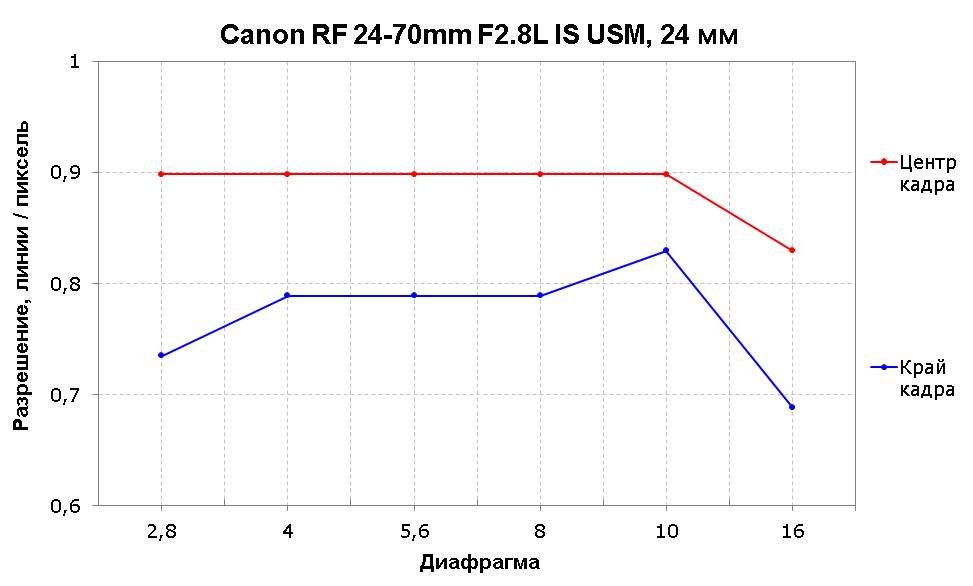 На широком «пейзажном» угле у Canon RF 24-70mm F2.8L IS USM превосходные для зум-объектива показатели разрешения в центре кадра во всем диапазоне диафрагм. Край кадра имеет более скромные значения на диафрагме F2,8, затем отставание сокращается до 0,1 линии на пиксель. Максимальный паритет центра и края кадра достигается при значении относительного отверстия F10.