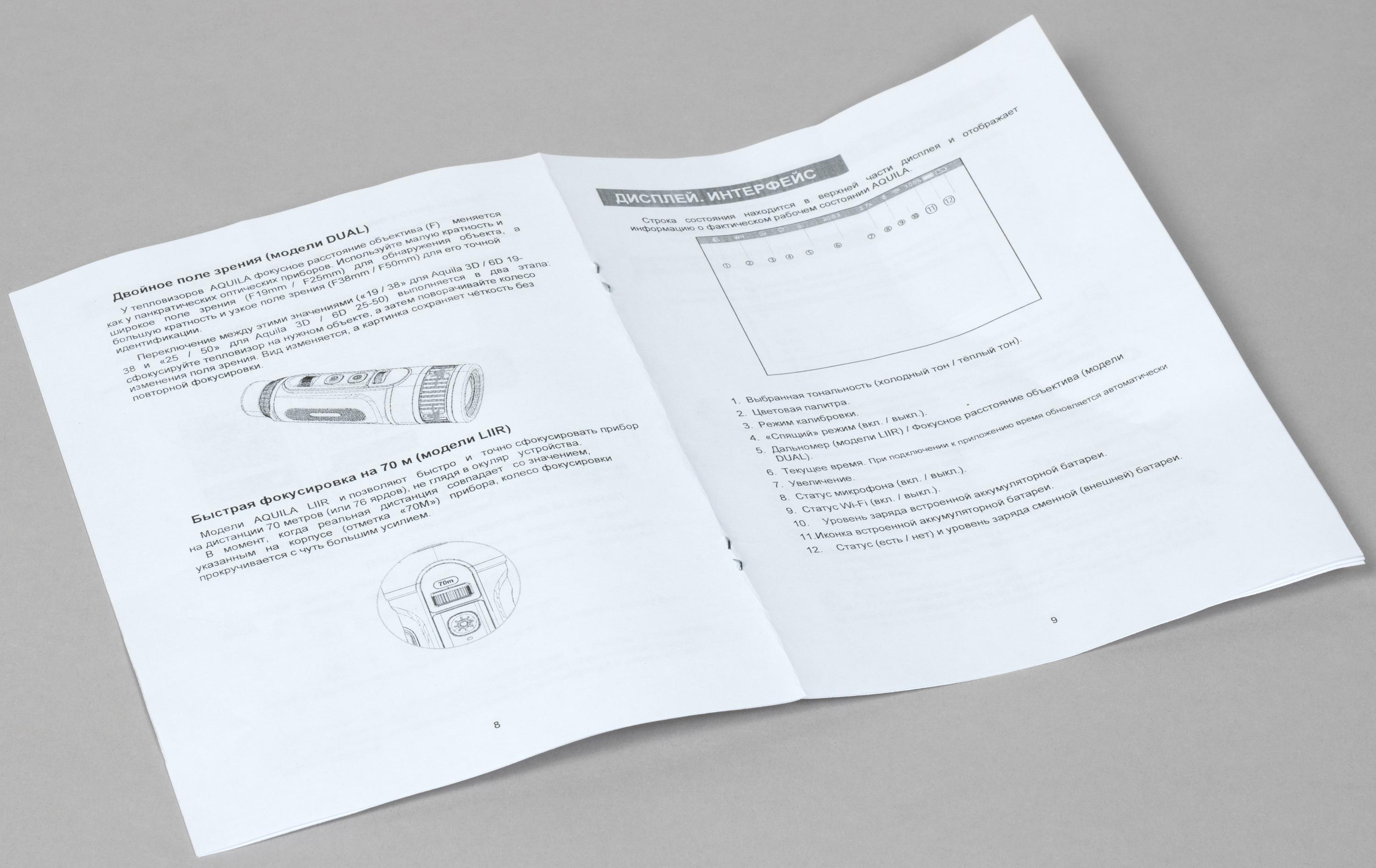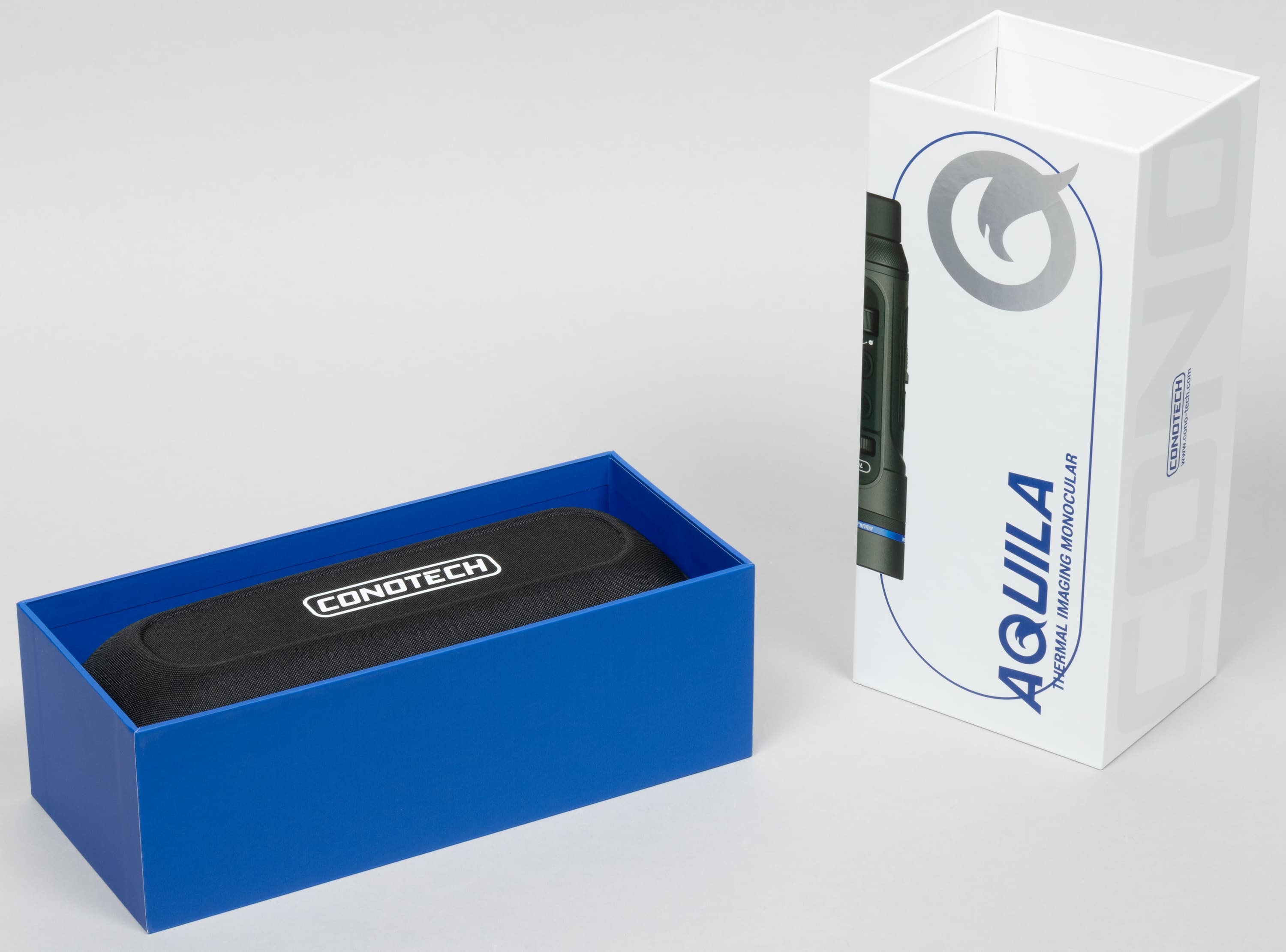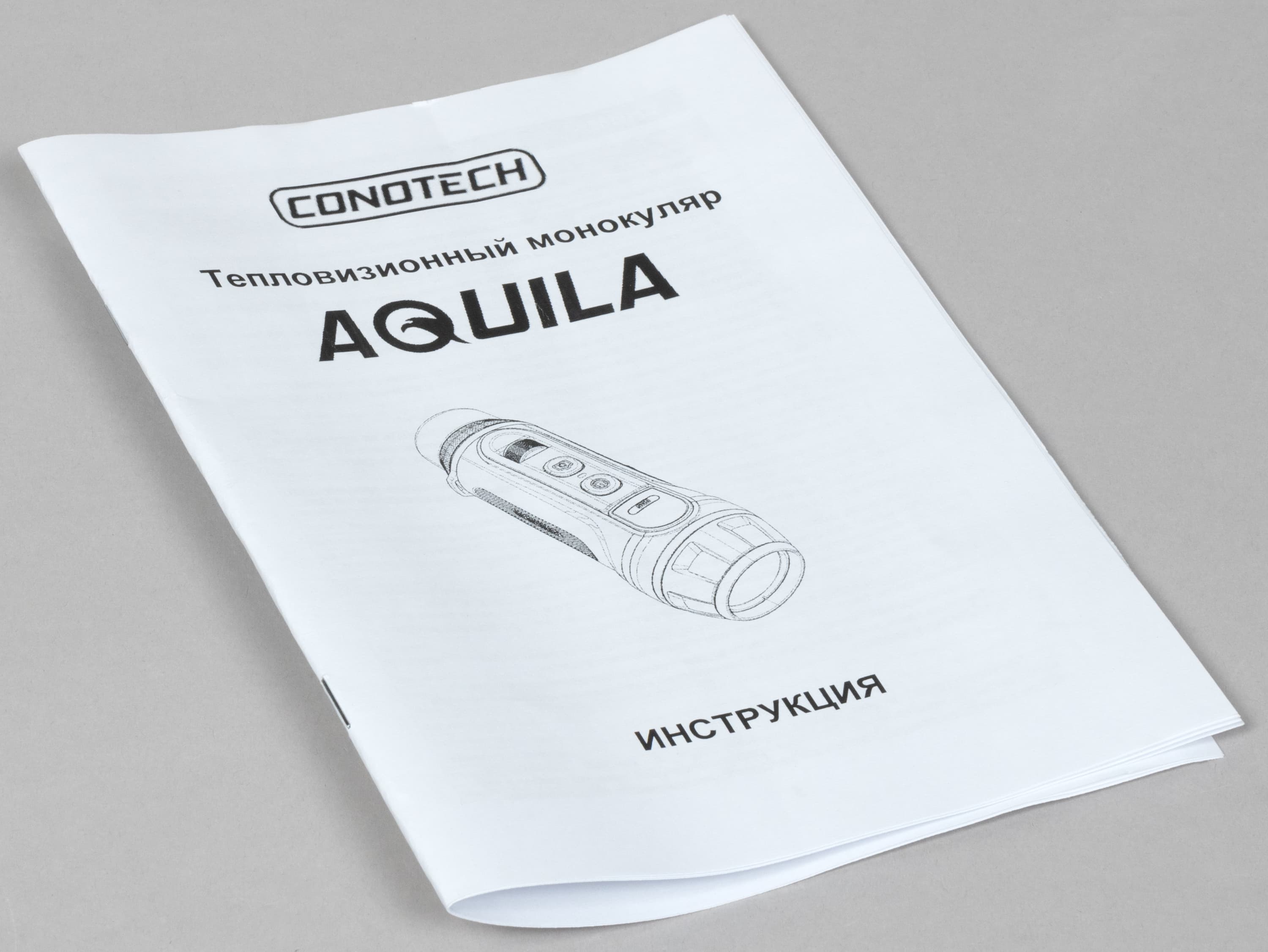 Тепловизор поставляется в плотной картонной коробке с лаконичным принтом, где перечислены все модели тепловизоров ConoTech Aquila. Никакой технической информации о приборе на коробке не имеется.
