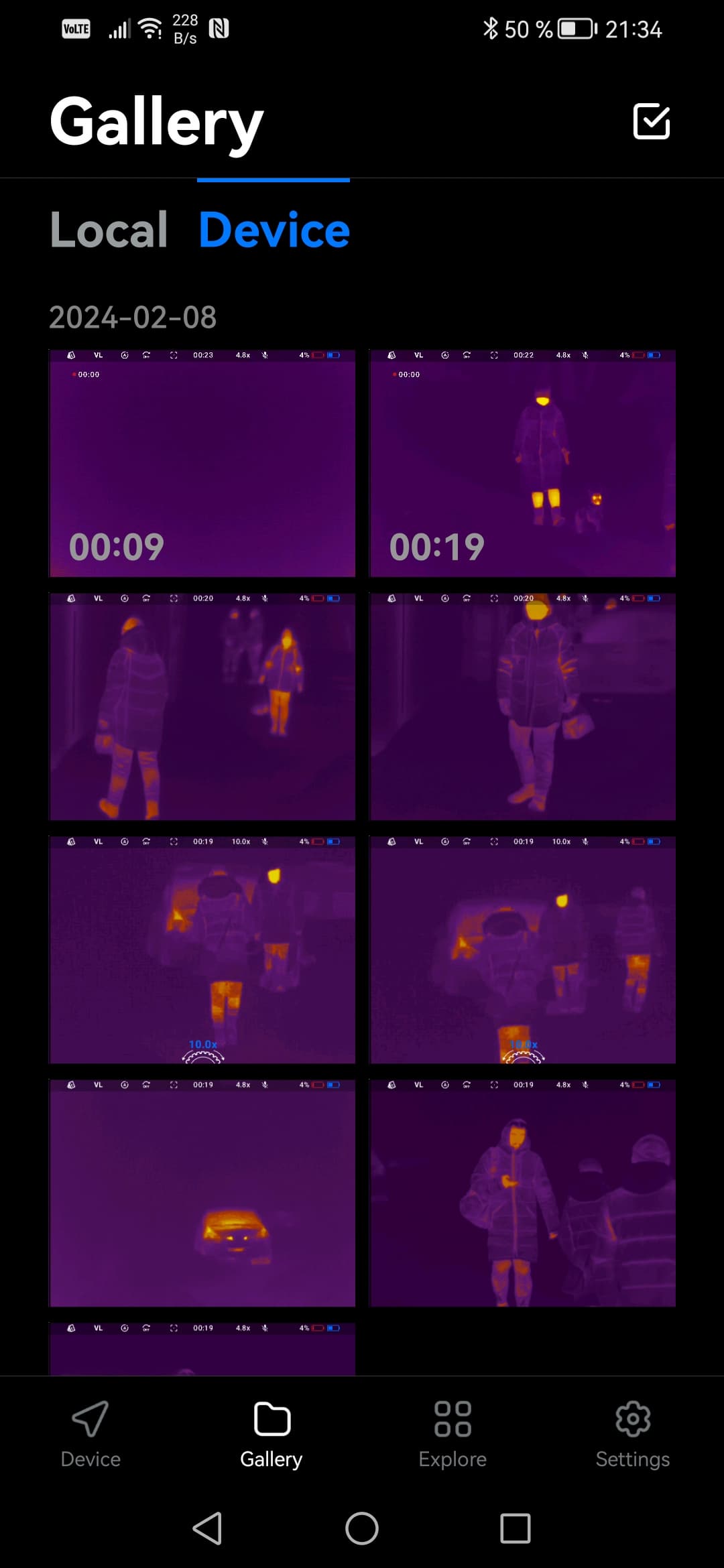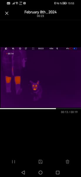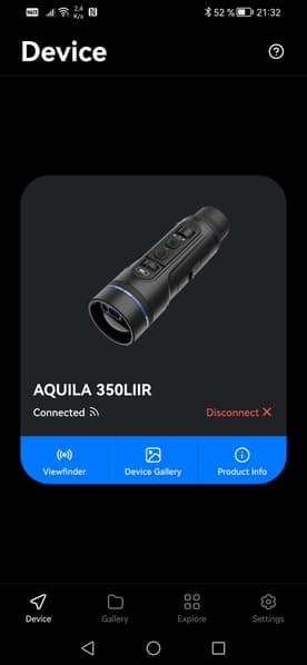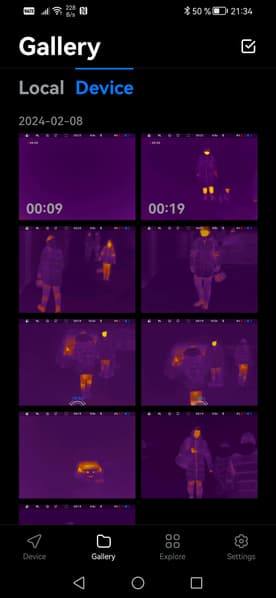 С помощью смартфона пользователь может вести наблюдение, находясь в укрытии на расстоянии от тепловизора (уверенная видеосвязь между смартфоном и тепловизором держится до 30 метров при отсутствии преград). Во время удаленного наблюдения можно запустить видеозапись или сделать снимок, данные при этом будут записаны во внутреннюю память тепловизора. Встроенная галерея файлов, записанных в память тепловизора, позволяет перенести материал в память смартфона, а видеоролики, находящиеся в памяти тепловизора, можно просмотреть здесь же, в галерее, без предварительной загрузки на смартфон (используется потоковое видео).