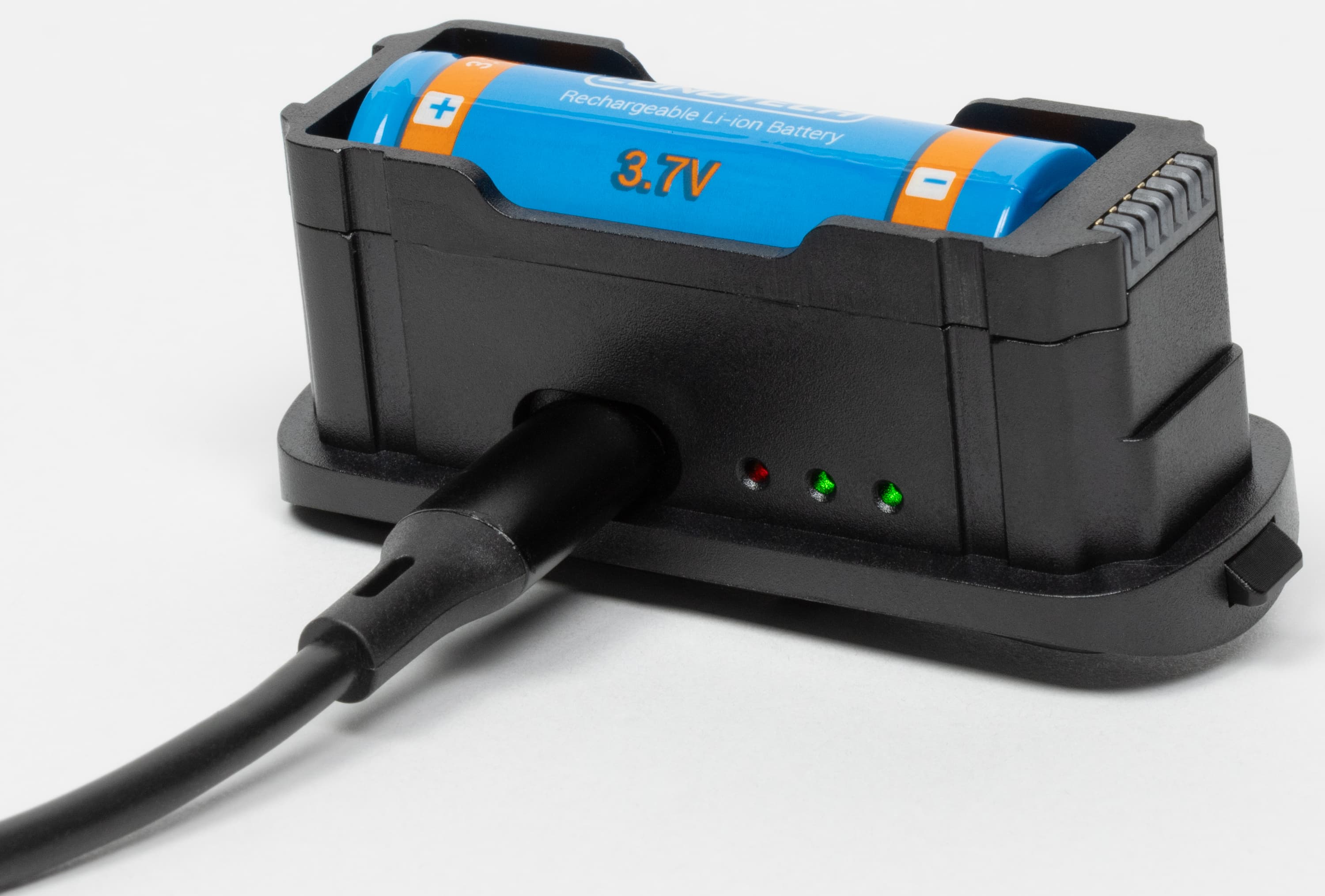 Питание для работы тепловизор получает от основного аккумулятора, который встроен в корпус. Однако разработчик предусмотрел возможность дополнительного питания, на всякий случай. Для этого на боку тепловизора имеется откидывающийся кармашек с доступом к слоту запасной аккумуляторной батареи. Она вставляется в съемный контейнер, который одновременно является зарядной станцией. Примечательно, что дополнительная батарея заряжается только в своем контейнере, но не будучи вставленной в корпус тепловизора.