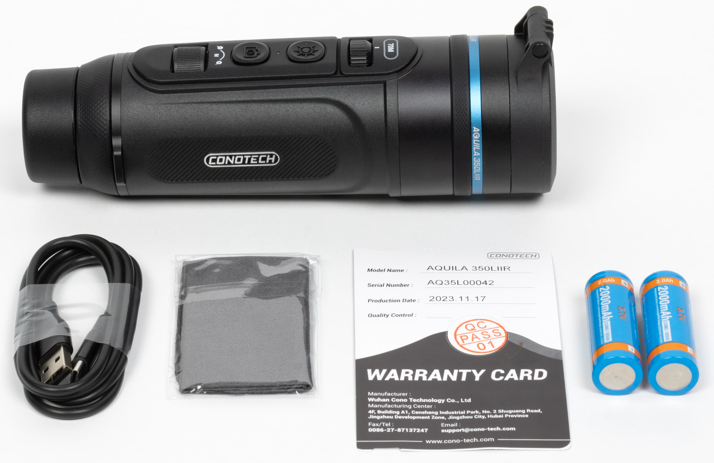 Комплектность устройства скромная, но достаточная для немедленного начала эксплуатации: сам тепловизор ConoTech Aquila 350LIIR, кабель USB Type A — USB Type C, салфетка для протирки оптики, два наполовину заряженных дополнительных 3,7-вольтовых аккумулятора ConoTech стандарта 18500 емкостью 2000 мА·ч каждый, гарантийный талон и руководство пользователя на русском языке (последнее в общий снимок не попало).