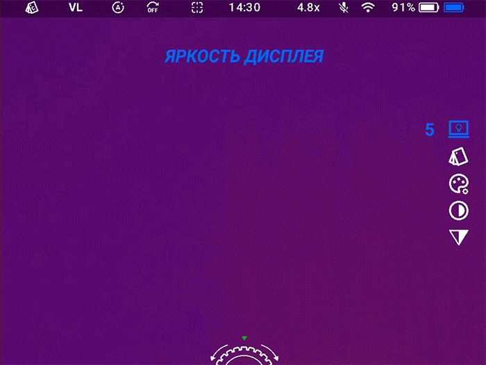 Второе роликовое колесико, находящееся с противоположной стороны корпуса, ближе к окуляру, используется для изменения фокусного расстояния. Проще говоря, это зум. Но одним лишь зумом функции ролика не ограничиваются. Дело в том, что данный ролик является также кнопкой, как колесико в компьютерной мышке. При этом тепловизор различает типы нажатий на колесико: короткое открывает быстрое меню с часто используемыми функциями, а при длительном запускается основное меню настроек прибора, включая системные. Для работы с меню используется это же колесико, которым производится навигация по пунктам и подтверждается их выбор.