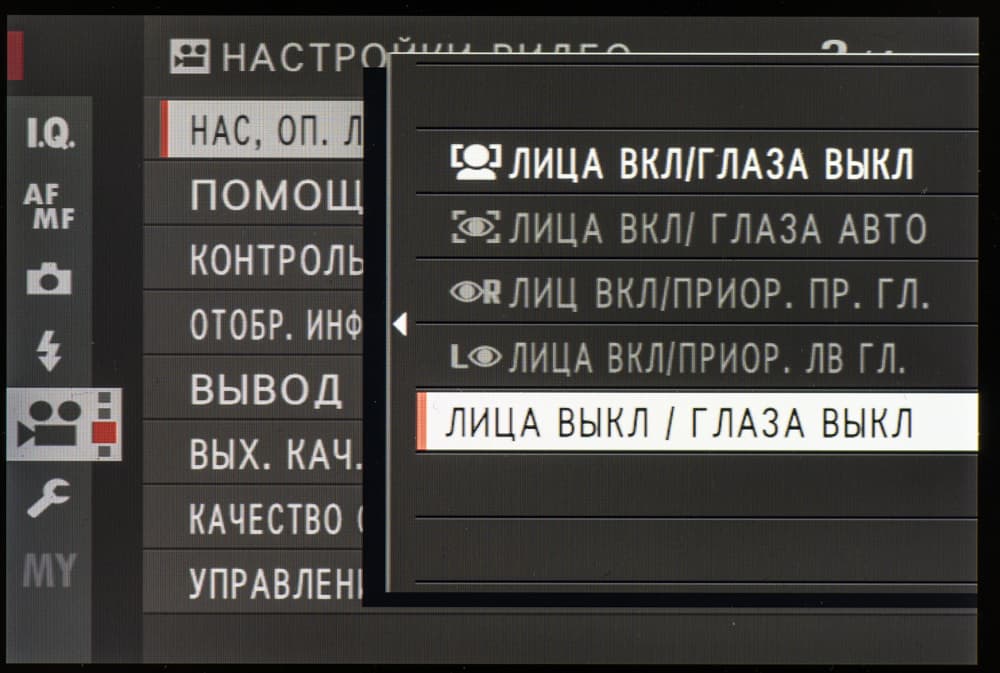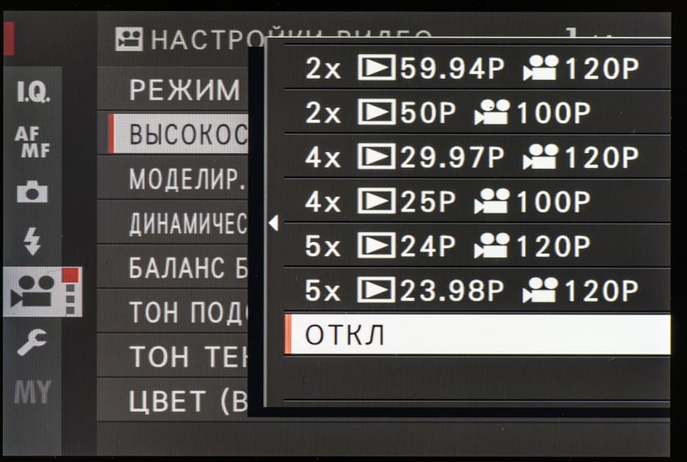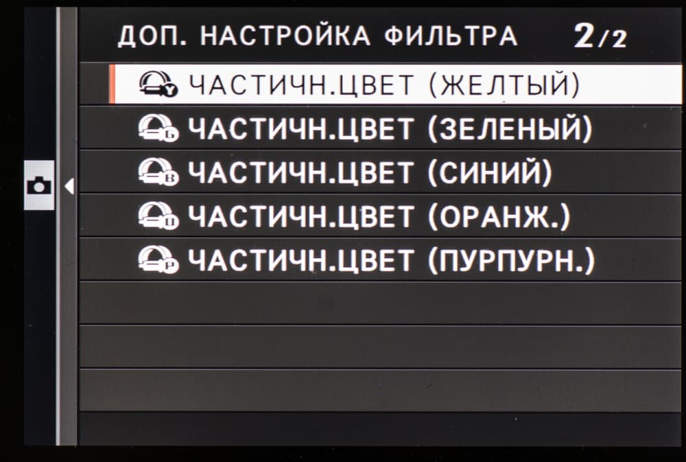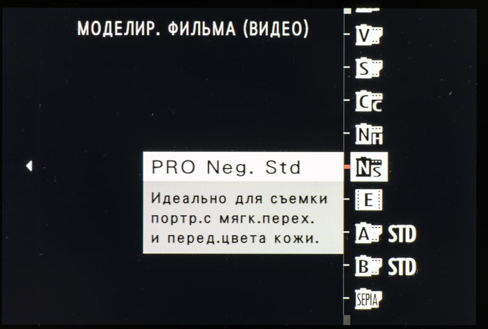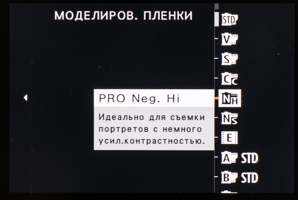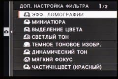 | Режимы имитации пленки | Provia (стандарт), Velvia (яркий), Astia (мягкий), Classic Chrome, Pro Neg.Hi, Pro Neg.Std, черно-белый, черно-белый с фильтрами (желтым, красным, зеленым), Sepia, Acros, Acros с фильтрами (желтым, красным, зеленым), Eterna (Cinema) эффекты зернистости (сильный, слабый, выкл.) |