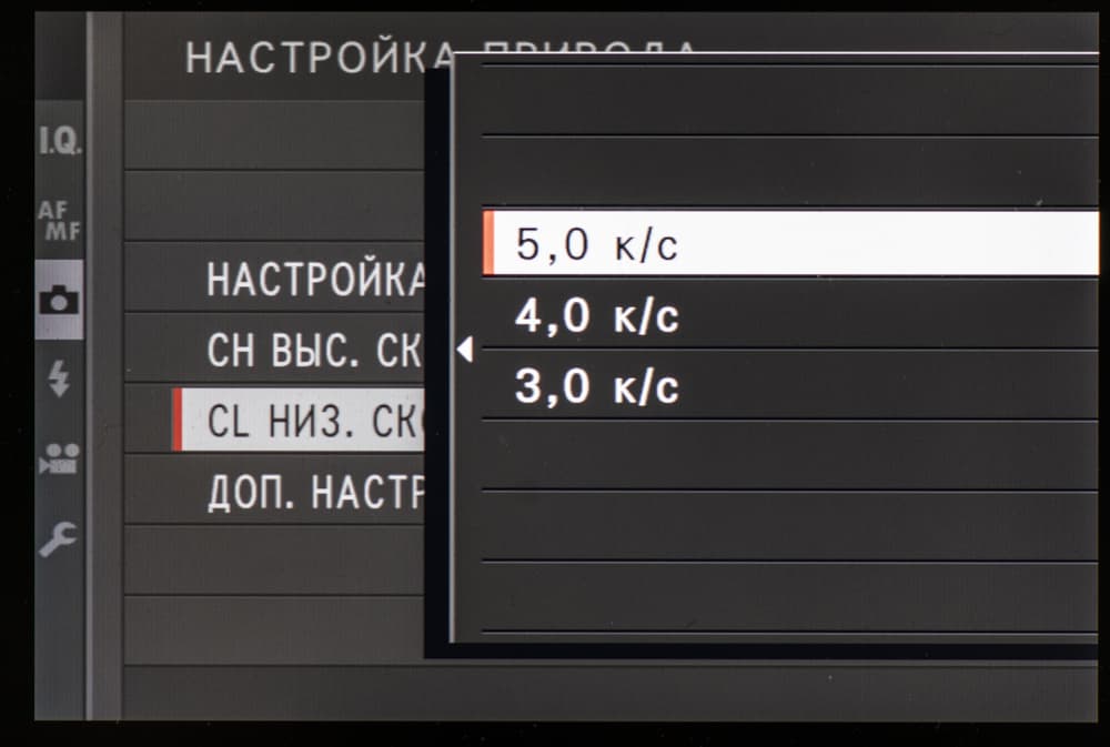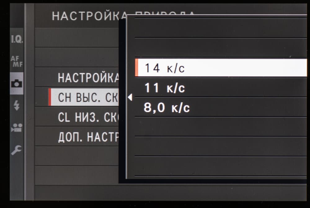В таблице приведены значения средней скорости съемки для разных режимов. Первой скоростью назовем ту, с которой серийная съемка стартует. Ее предел — время, после которого съемка замедляется и продолжается со второй скоростью. Единицы измерения — кадры в секунду и секунды соответственно. Символ бесконечности означает, что при съемке ста кадров скорость не изменилась.