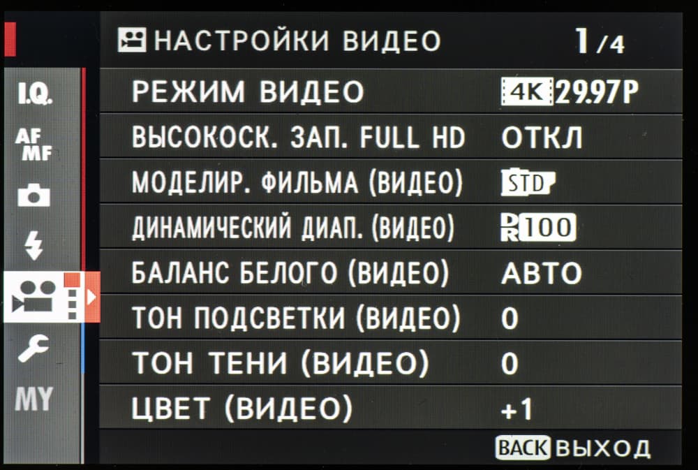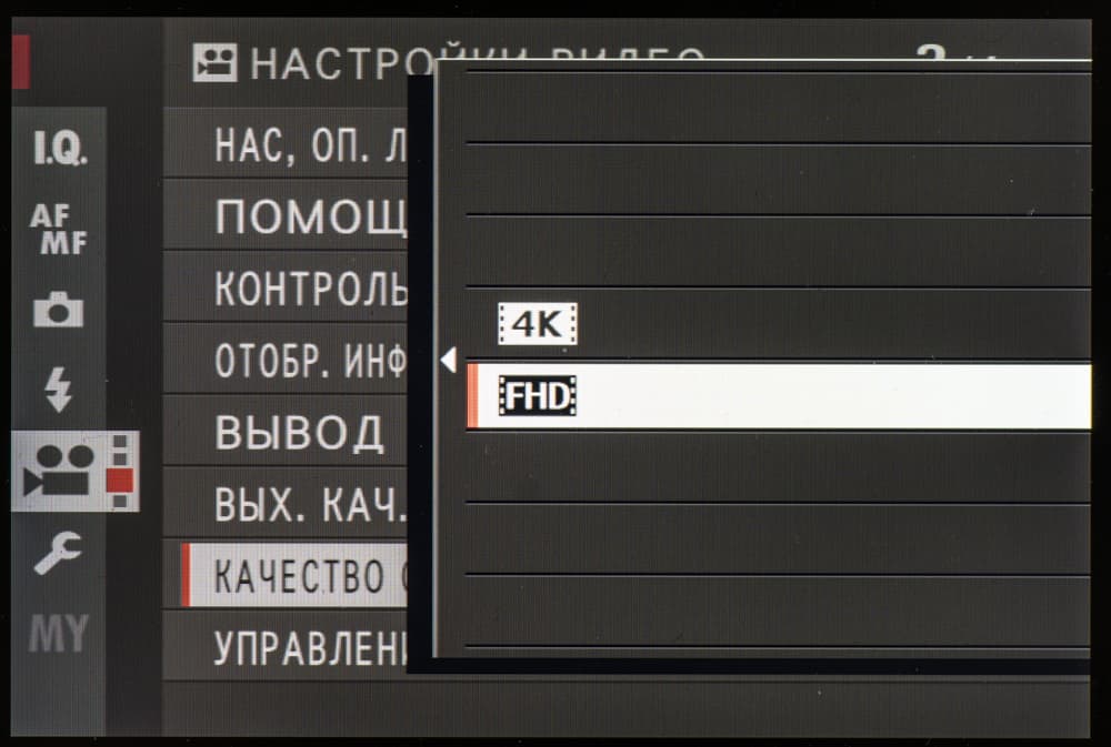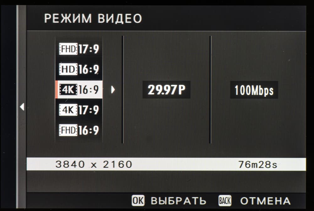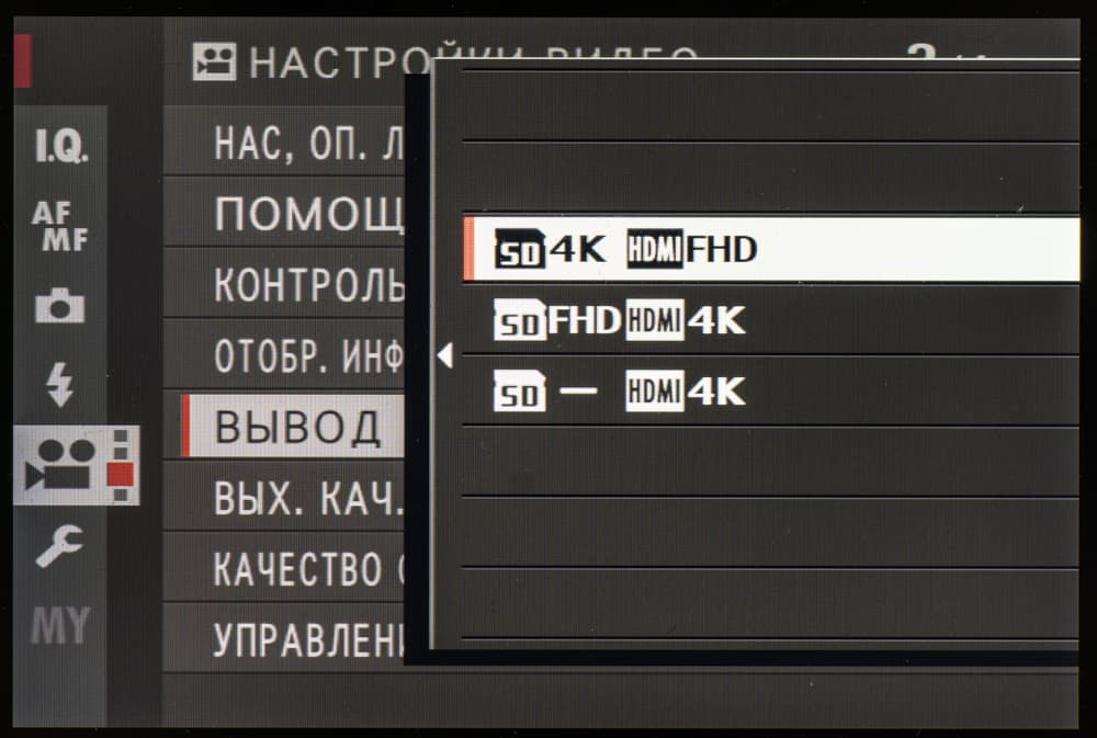 Максимальное разрешение записи видео в 4K (4096×2160) предоставляет небольшой запас по длинной стороне кадра, хотя доступен и стандартный режим 3840×2160. При записи можно сохранить параметры изображения в F-log. Если использовать интерфейс HDMI и внешний рекордер, то поддерживается сэмплинг цветов4:2:2 с 8-битной глубиной цвета. На SD-карту запись происходит с некоторой редукцией (4:4:0).