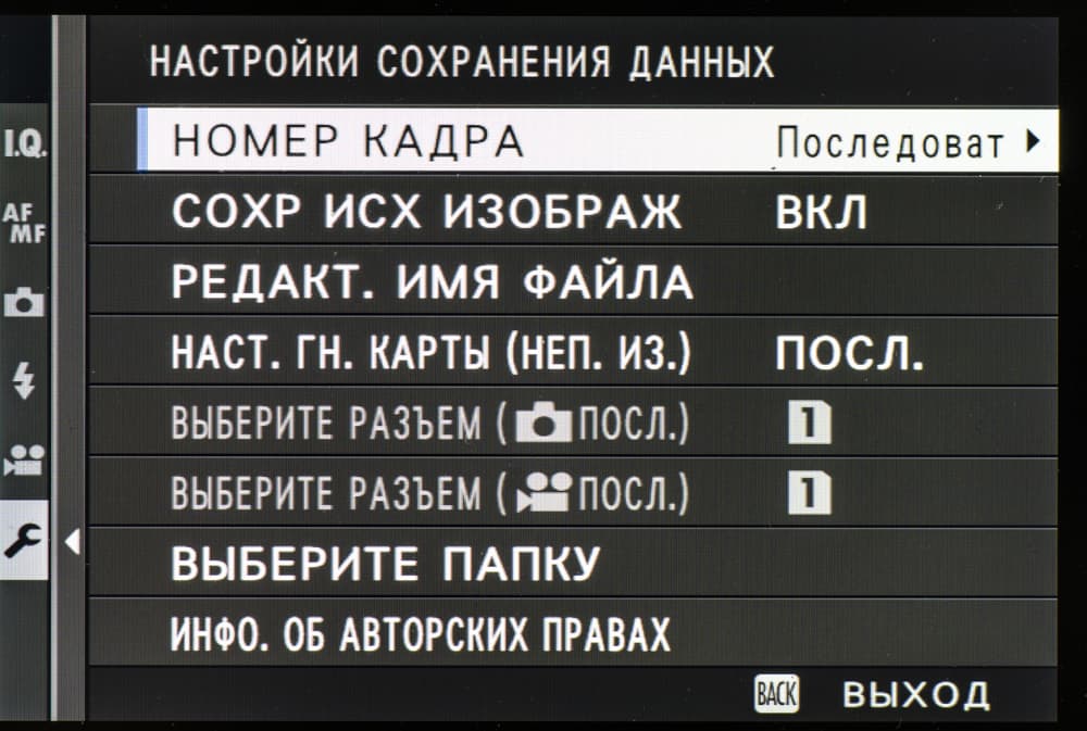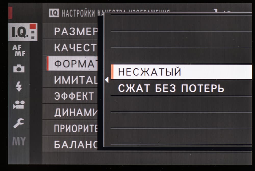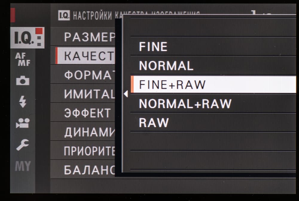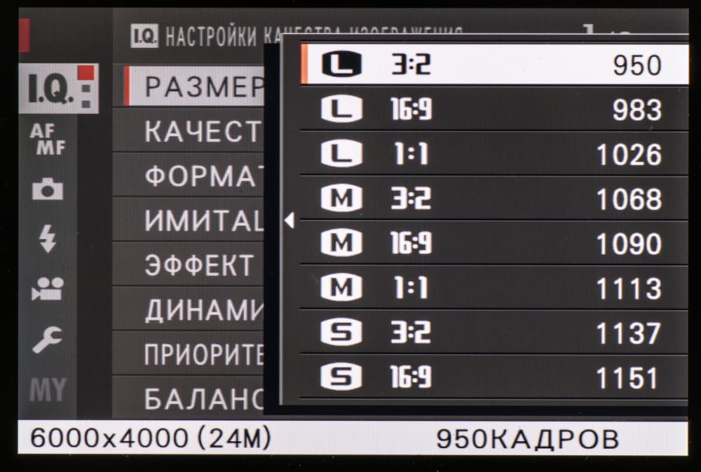 | Формат записи фотоснимков | JPEG (Exif 2.3), RAW (14-битный RAF); 3:2: 6000×4000, 4240×2832, 3008×2000; 16:9: 6000×3376, 4240×2384, 3008×1688; 1:1: 4000×4000, 2832×2832, 2000×2000 |