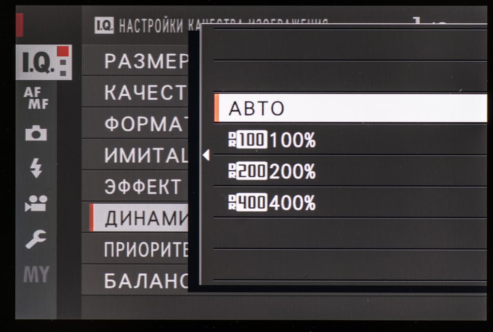 | Расширение динамического диапазона | авто, 100% 200% (при ISO 400 и выше), 400% (при ISO 800 и выше) |