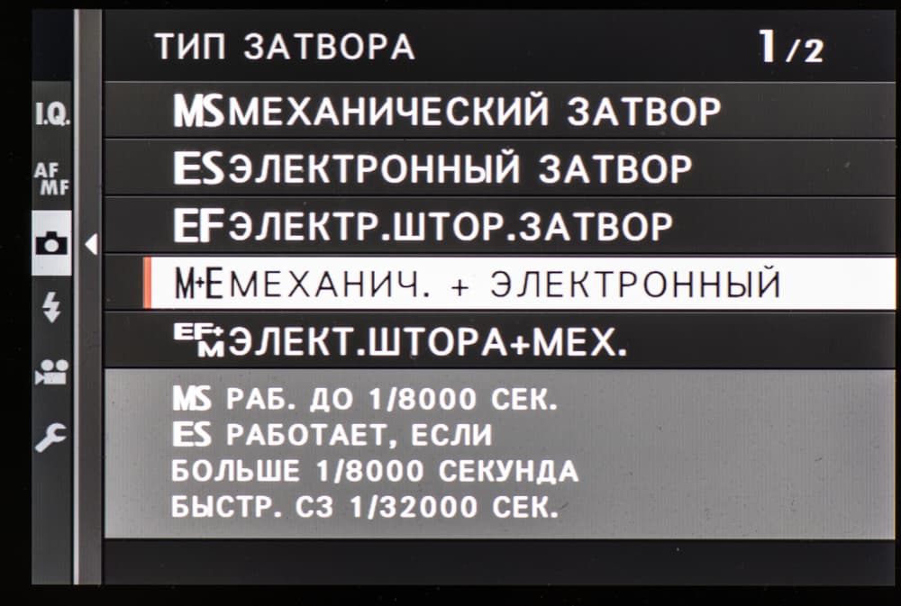 | Скорость затвора | механический затвор: «P» 4–1/8000 с, «A» 30–1/8000 с, «S»/«M» 15 мин – 1/8000 с; электронный затвор: «P» 4–1/32000 с, «A» 30–1/32000 с, «S»/«M» 15 мин – 1/32000 с; с электронной передней шторкой: «P» 4–1/8000 с, «A» 30–1/8000 с, «S»/«M» 15 мин – 1/8000 с; механический + электронный: «P» 4–1/32000 с, «A» 30–1/32000 с, «S»/«M» 15 мин – 1/32000 с; с электронной передней шторкой + механический: «P» 4–1/8000 с, «A» 30–1/8000 с, «S»/«M» 15 мин – 1/8000 с; с электронной передней шторкой + механический + электронный: «P» 4–1/32000 с, «A» 30–1/32000 с, «S»/«M» 15 мин – 1/32000 с |