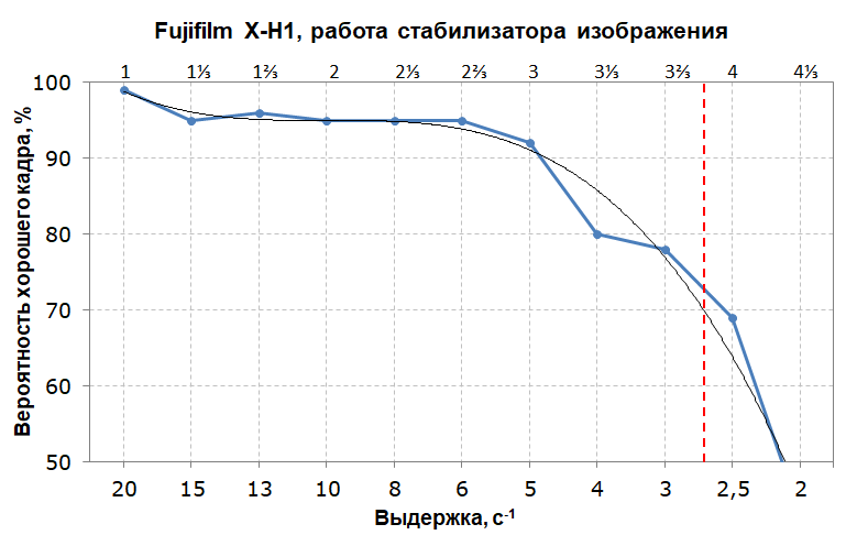 Fujifilm X-H1 оснащена внутрикамерным стабилизатором изображения. Производитель заявляет эффективность в 5,5 ступеней экспозиции. Наша методика подтверждает почти 4 ступени, что тоже очень достойный результат, поскольку работа стабилизатора видна даже невооруженных взглядом.