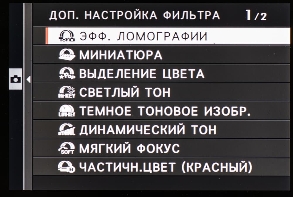 | Эффекты изображения | Toy camera, Miniature, Pop color, High-key, Low-key, Dynamic tone, Soft focus, Partial color (красный, оранжевый, желтый, зеленый, синий, фиолетовый) |