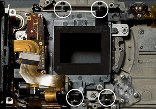 Демпфирующая пружинная подвеска гасит вибрации, предотвращая «смаз» изображения, вызванный срабатыванием затвора. Этот же механизм позволяет значительно уменьшить шум, вызванный движениями шторок, благодаря чему затвор не щелкает, а тихо «шелестит».
