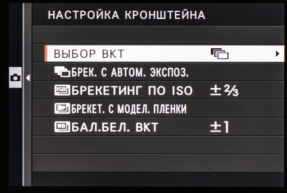 | Автобрекетинг | по экспозиции (±3EV, ±8/3EV, ±7/3EV, ±2EV, ±5/3EV, ±4/3EV, ±1EV, ±2/3EV, ±1/3EV), по типу пленки (3 типа на выбор), по динамическому диапазону (100%, 200%, 400%), по ISO (±1/3EV, ±2/3EV, ±1EV), по балансу белого (±1, ±2, ±3) |