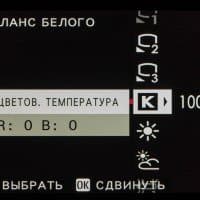 | Баланс белого | авто: приоритет белого, авто, приоритет окружающего освещения; пользовательский: три установки; прямая установка цветовой температуры от 2500 до 10000 K; пресеты: солнечно, тень, люминесцентный свет (дневного спектра, теплый белый, холодный белый), лампы накаливания, под водой |