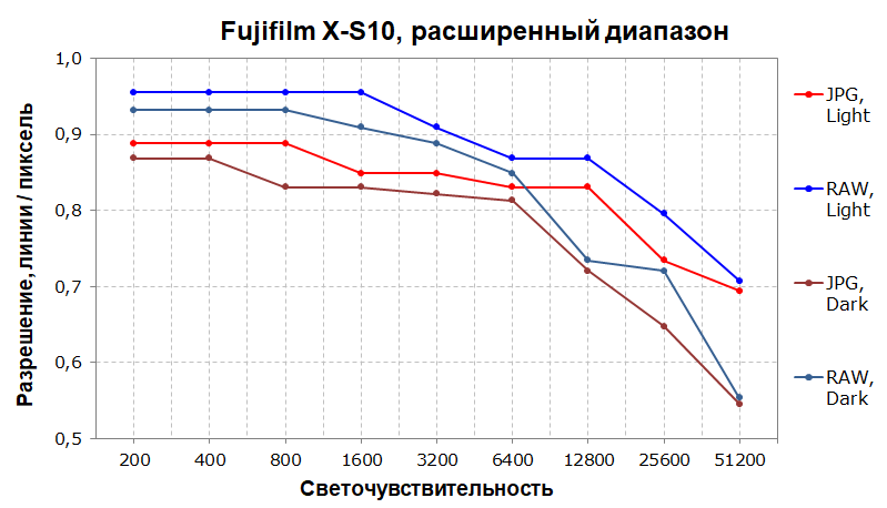 В расширенном диапазоне светочувствительности RAW и JPEG в светлой сцене на ISO 12800 выдают более 80%, а в темной — более 70%, что является хорошим результатом. При этом во всем диапазоне светочувствительности разрешение в светлой сцене не падает ниже 70%.