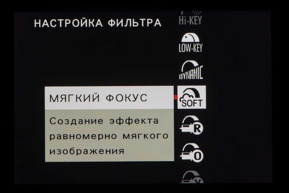 Стиль внутрикамерной постобработки доступен при выборе опции Filter на главном селекторе съемочных режимов. Переключение между фильтрами разного типа производится левым немаркированным колесом. Файлы RAW записываются без обработки, последствия применения фильтров видны только в JPEG.
