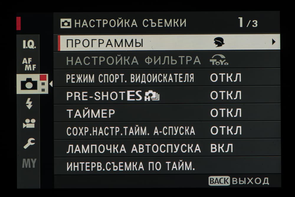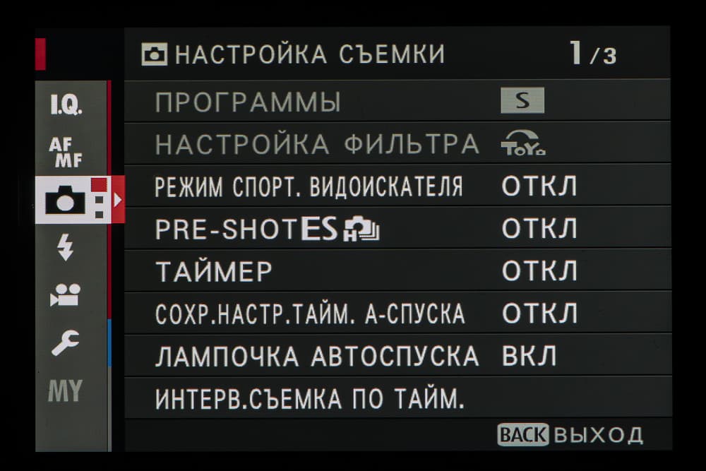 4 Pre-shot — режим предварительной съемки; запись кадров во внутренний буфер начинается при нажатии кнопки спуска затвора наполовину.
