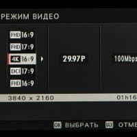 | Разрешение и длительность записи видео | DCI 4K 4096×2160 при 29,97/25/24/23,98p с потоком 200/100 Мбит/с — до 30 мин.; UHD 4K 3840×2160 при 29,97/25/24/23,98p с потоком 200/100 Мбит/с — до 30 мин.; 2K HD 2048×1080 при 59,94/50/29,97/25/24/23,98p с потоком 200/100/50 Мбит/с — до 30 мин.; Full HD 1920×1080 при 59,94/50/29,97/25/24/23,98p с потоком 200/100/50 Мбит/с — до 30 мин.; High-speed Movie (рапида) Full HD 1920×1080 при 240/200p с потоком 200 Мбит/с — до 3 мин.; при 120/100p с потоком 200 Мбит/с — 6 мин. |