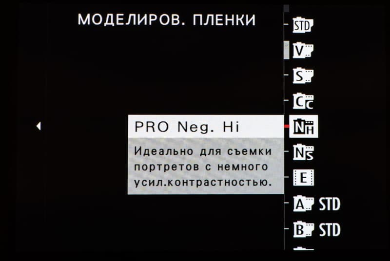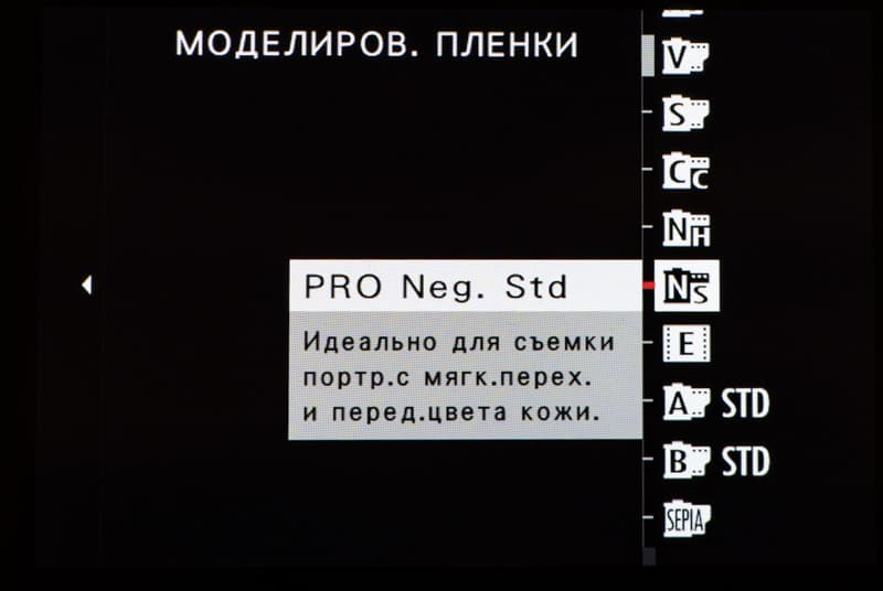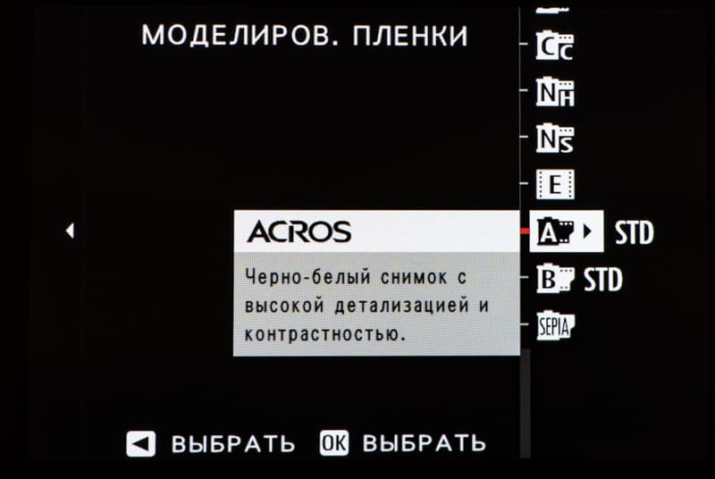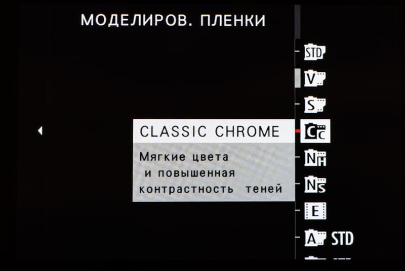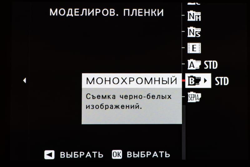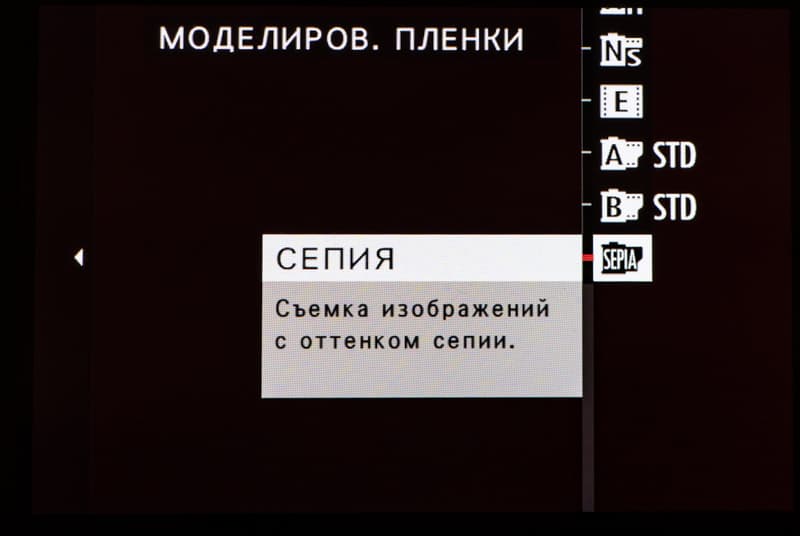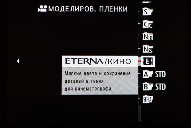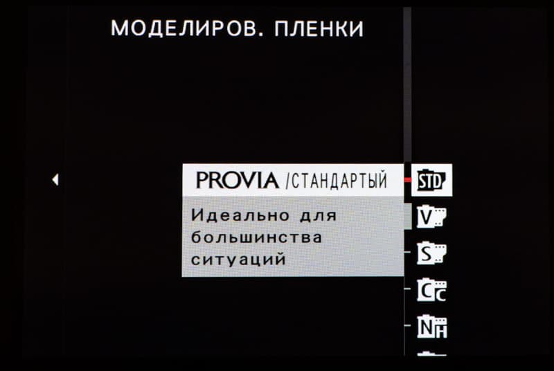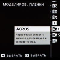 | Режимы имитации пленки | Provia/Standard, Velvia/Vivid, Astia/Soft, Classic Chrome, Pro Neg.Hi, Pro Neg.Std, Black & White, Black & White+Ye Filter, Black & White+R Filter, Black & White+G Filter, Sepia, Acros, Acros+Ye Filter, Acros+R Filter, Acros+G Filter, Eterna/Cinema |
