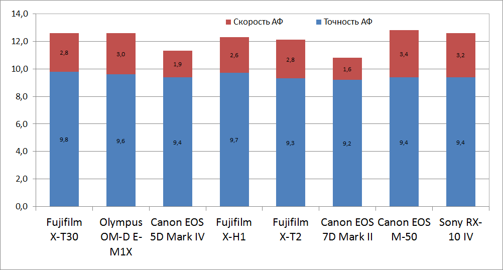 По точности автофокуса камера абсолютный лидер, даже немного опережает X-H1, до сих пор носившую звание самой точной в нашем рейтинге. Из реальных конкурентов по скорости камера уступает, пожалуй, только Canon M-50, а Olympus OM-D E-M1X и Sony RX-10 IV вырываются вперед за счет меньшего сенсора.