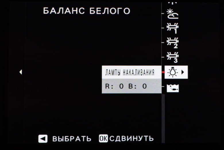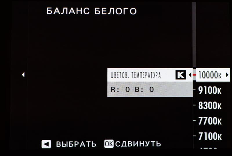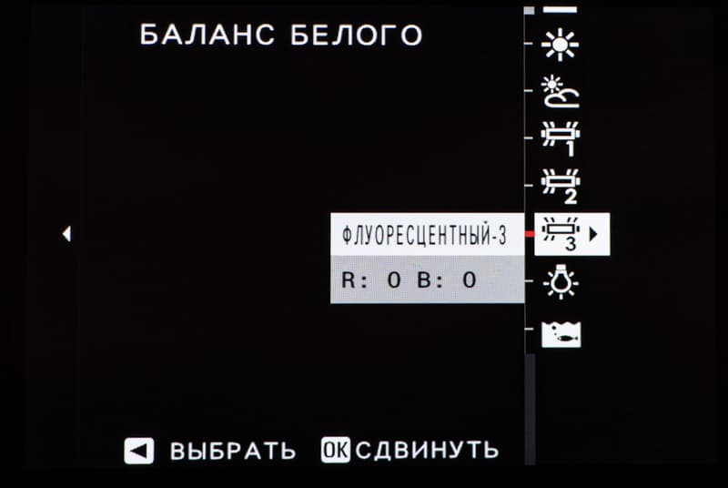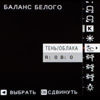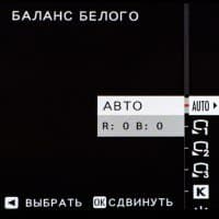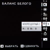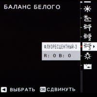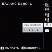 | Баланс белого | авто, предварительные установки (солнечный свет, тень, люминесцентная лампа (дневного света, теплый белый, холодный белый), лампа накаливания, под водой), ручная установка (3 значения), выбор цветовой температуры (2500—10000 K) |