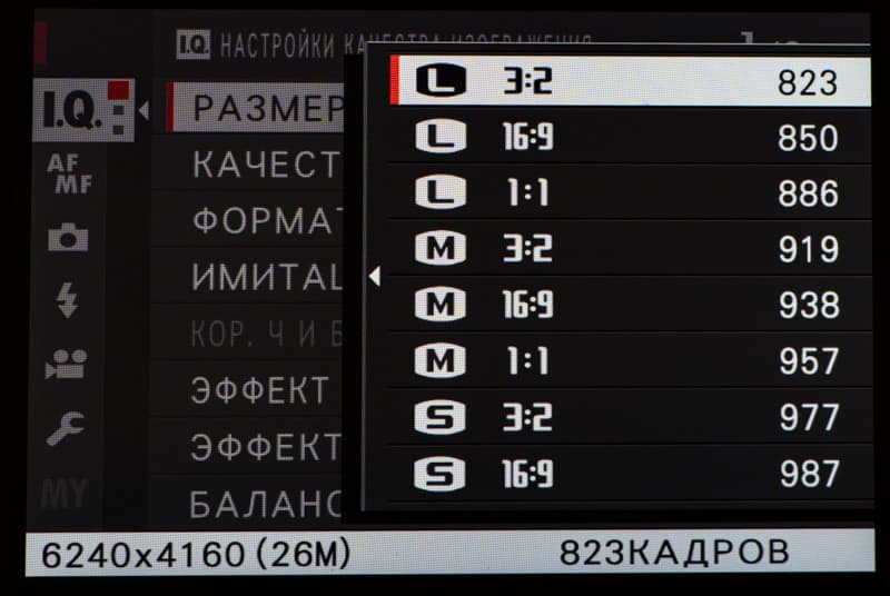| Разрешение фотоснимков | L: 3:2 — 6240×4160, 16:9 — 6240×3512, 1:1 — 4160×4160; M: 3:2 — 4416×2944, 16:9 — 4416×2488, 1:1 — 2944×2944; S: 3:2 — 3120×2080, 16:9 — 3120×1760, 1:1 — 2080×2080; панорама L: вертикальная 2160×9600, горизонтальная 9600×1440; панорама M: вертикальная 2160×6400, горизонтальная 6400×1440 |