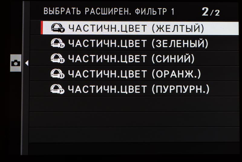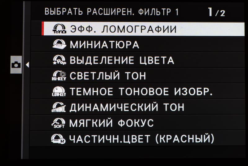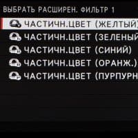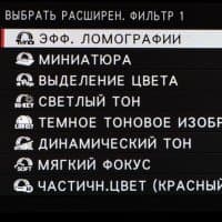 | Художественные эффекты | Toy camera, Miniature, Pop color, High-key, Low-key, Dynamic tone, Soft focus, моноцвет (красный, оранжевый, желтый, зеленый, синий, фиолетовый) |