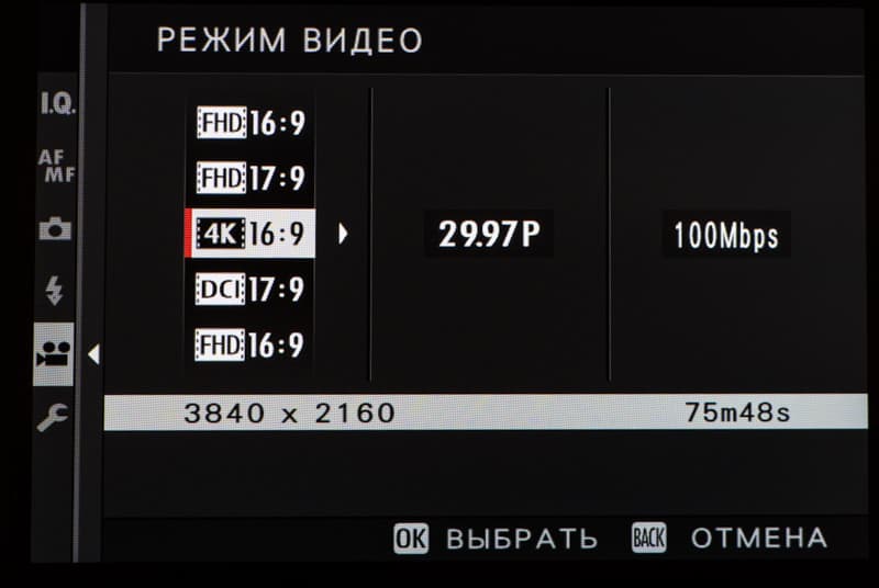 Максимальное разрешение при съемке составляет 4096×2160 пикселей (стандарт DCI 4K, 17:9) при 29,97 кадров/с с прогрессивным сканированием и потоком 200 Мбит/с. Это позволяет получить чуть более широкоэкранную картинку, чем стандартная 16:9 и предоставляет пусть и небольшие, но ощутимые преимущества при последующем монтаже. В привычном UHD 4K (3840×2160) видео записывается также при 29,97 кадрах/с и с потоком 200 или 100 Мбит/с. Длительность записи в обоих режимах с количеством строк 2160 ограничено 10 мин.