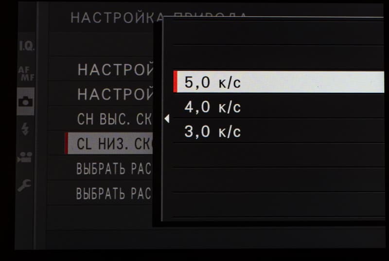 В таблице приведены значения средней скорости съемки для разных режимов. Первой скоростью назовем ту, с которой серийная съемка стартует. Ее предел — время, после которого съемка замедляется и продолжается со второй скоростью. Единицы измерения — кадры в секунду и секунды соответственно. Символ бесконечности означает, что при съемке ста кадров скорость не изменилась.