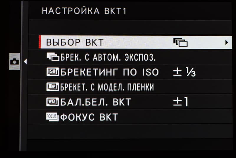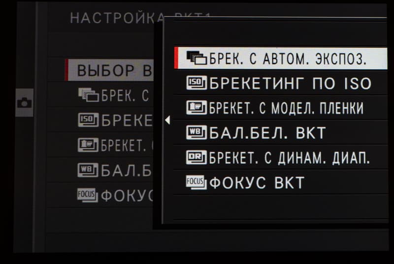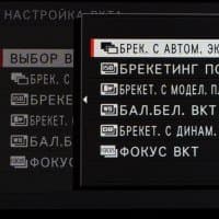 | Автобрекетинг | по экспозиции: 2, 3, 5, 7 или 9 кадров с шагом 1/3, 2/3, 1 EV и 7 кадров с шагом 1/3, 2/3, 1, 4/3, 5/3, 2, 7/3, 8/3 или 3 EV; по ISO: 3 кадра с шагом 1/3, 2/3, 1 EV; по балансу белого: 3 кадра с шагом 2, 4 или 6 ступеней майред; по динамическому диапазону2: 3 кадра при 100%, 200%, 400%; по имитируемой пленке: любые три типа на выбор; со сдвигом точки фокусировки: 1—999 кадров с шагом 1—10 и интервалом 0—10 с |