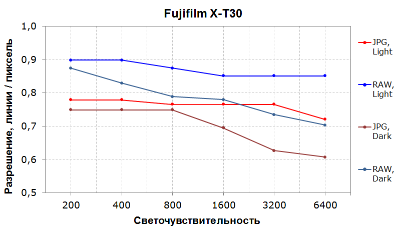 Камера демонстрирует высокое разрешение практически на всем диапазоне испытаний. Светлый RAW держится чуть ли не эталонно: разрешающая способность с увеличением светочувствительности до ISO 6400 незначительно падает с 90% до 85%. В темной сцене падение более явное — до 70%, что тоже очень неплохо. Светлый JPEG уверенно держится чуть ниже 80%, а вот в темном разрешение падает начиная с ISO 1600 — до 60% при ISO 6400. Это, конечно, не слишком высокий результат, но в таких сложных условиях простительно.