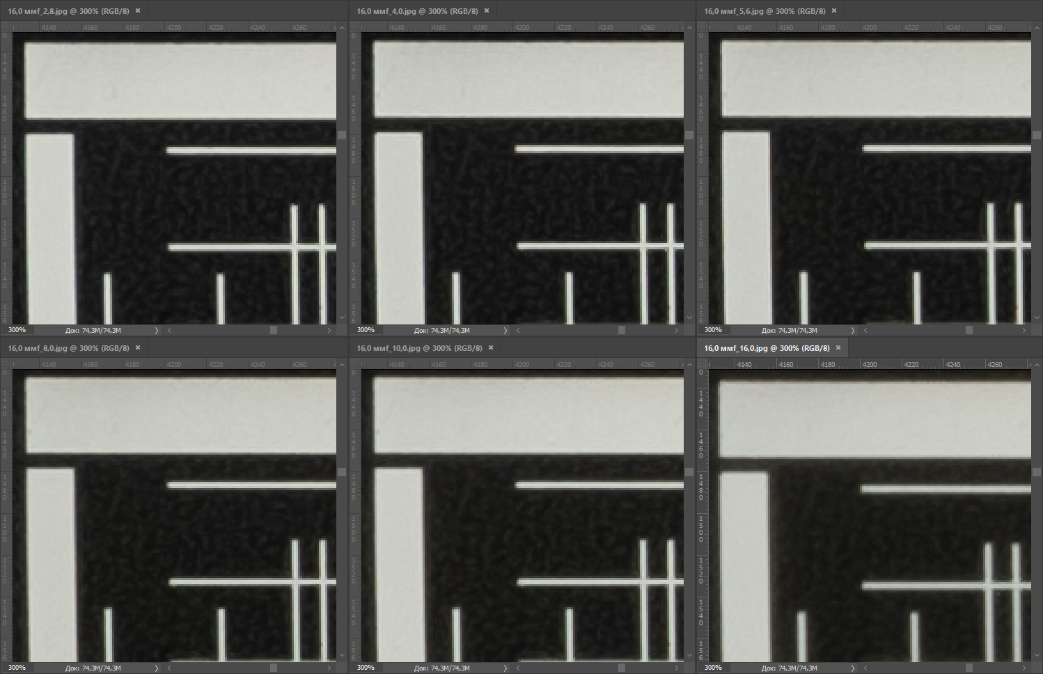 При всех трех вариантах зумирования картина выглядит примерно одинаково. Резкость в центре кадра вполне достойная уже при максимальном раскрытии; в диапазоне F4—F5,6 она увеличивается и достигает максимума при F8, а при F11 и далее начинает понижаться из-за пагубного влияния дифракции. Резкость на периферии кадра при F2,8 невысока, при F4 несколько увеличивается, при F5,6 уже мало отличается от центральной, а при F8—F16 выглядит почти одинаковой по всему полю кадра. Дальнейшее диафрагмирование приводит к понижению резкости из-за пагубного влияния дифракции. Виньетирование хорошо заметно при F2,8 и F4, в значительной мере нивелируется при F5,6 и исчезает при F8 и более сильном диафрагмировании. Латеральные (боковые) хроматические аберрации едва заметны на максимальном удалении от центра кадра при F2,8—F4, а при более сильном диафрагмировании не выявляются.