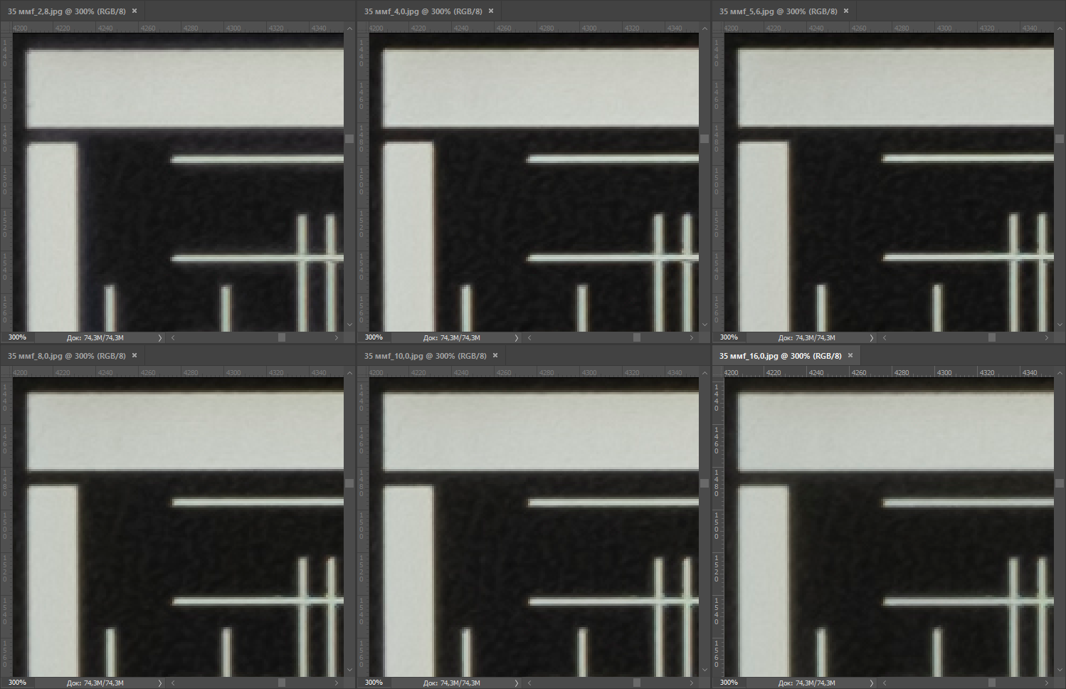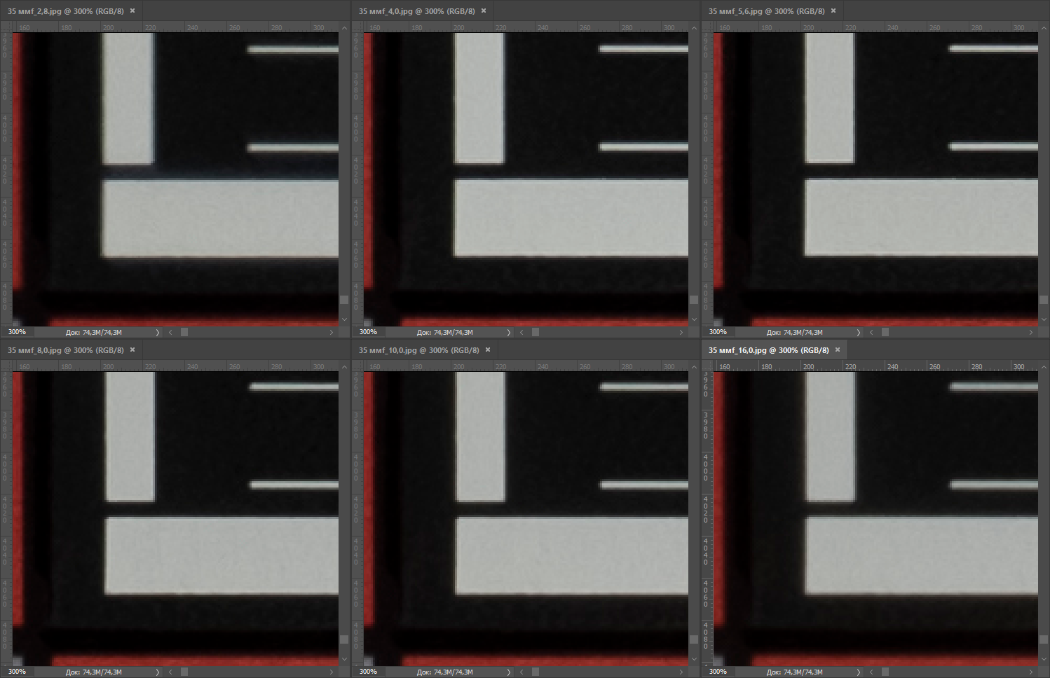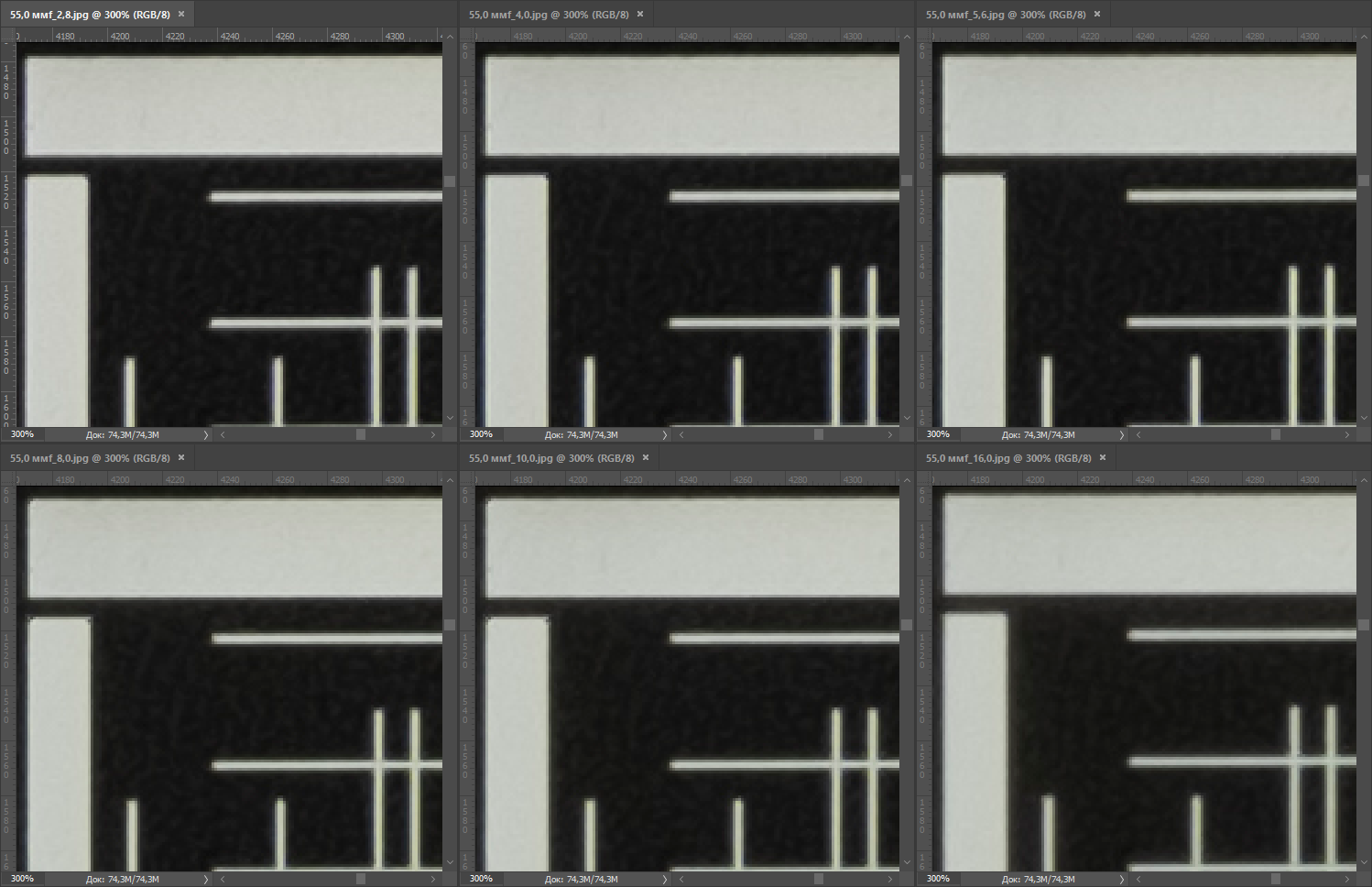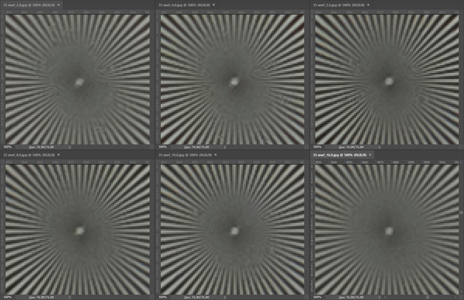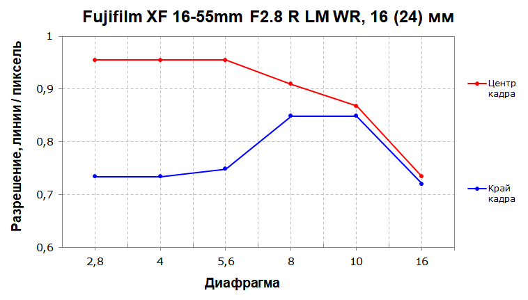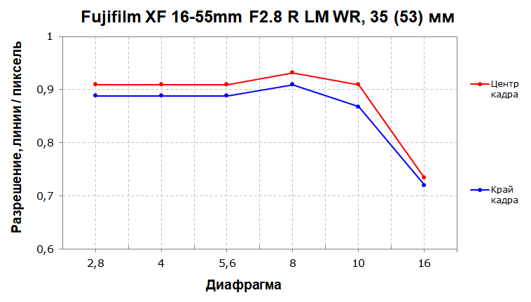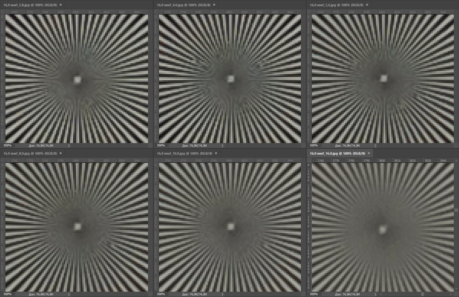 При всех значениях диафрагмы центральная резкость остается очень хорошей, а периферийная усиливается в ряду значений F2,8—F8 и в дальнейшем снижается при F16—F22 (очевидно, из-за дифракции).