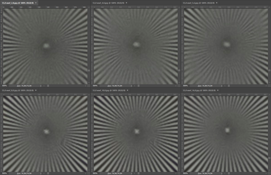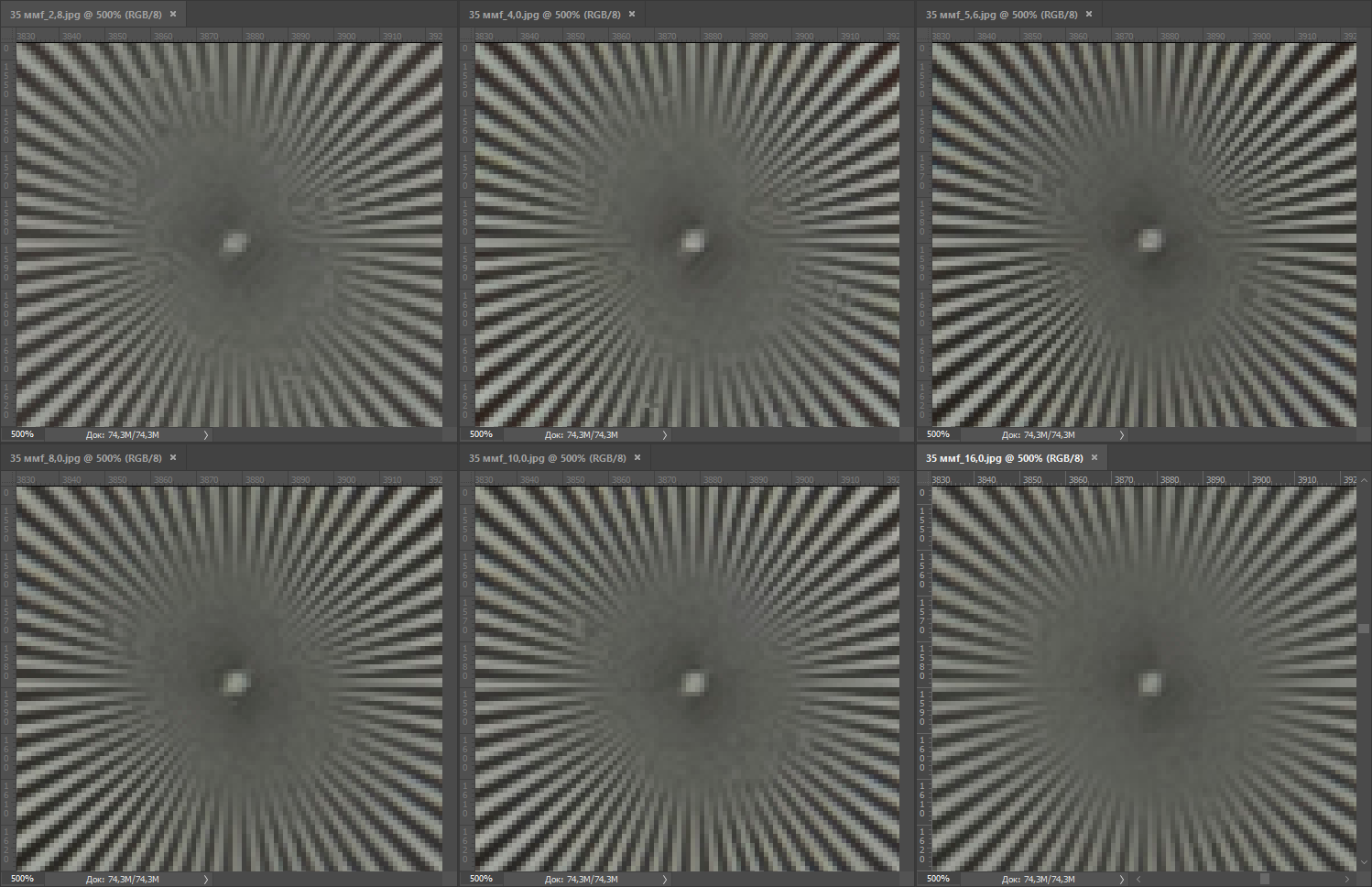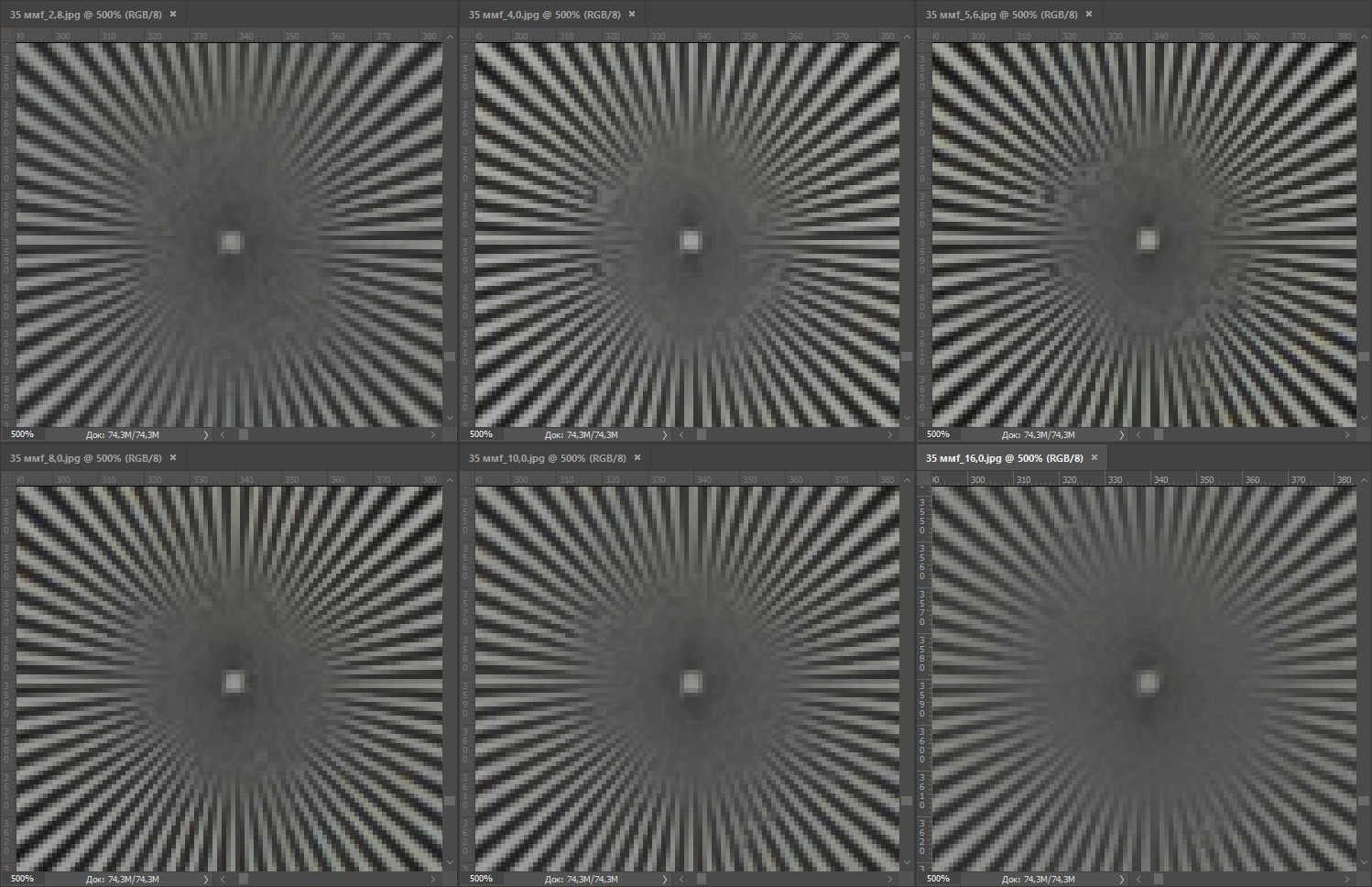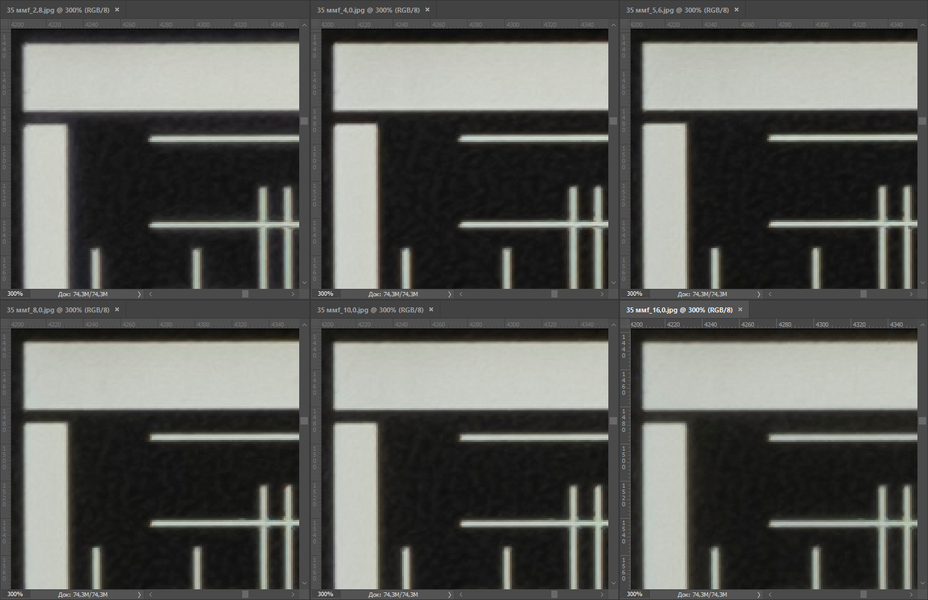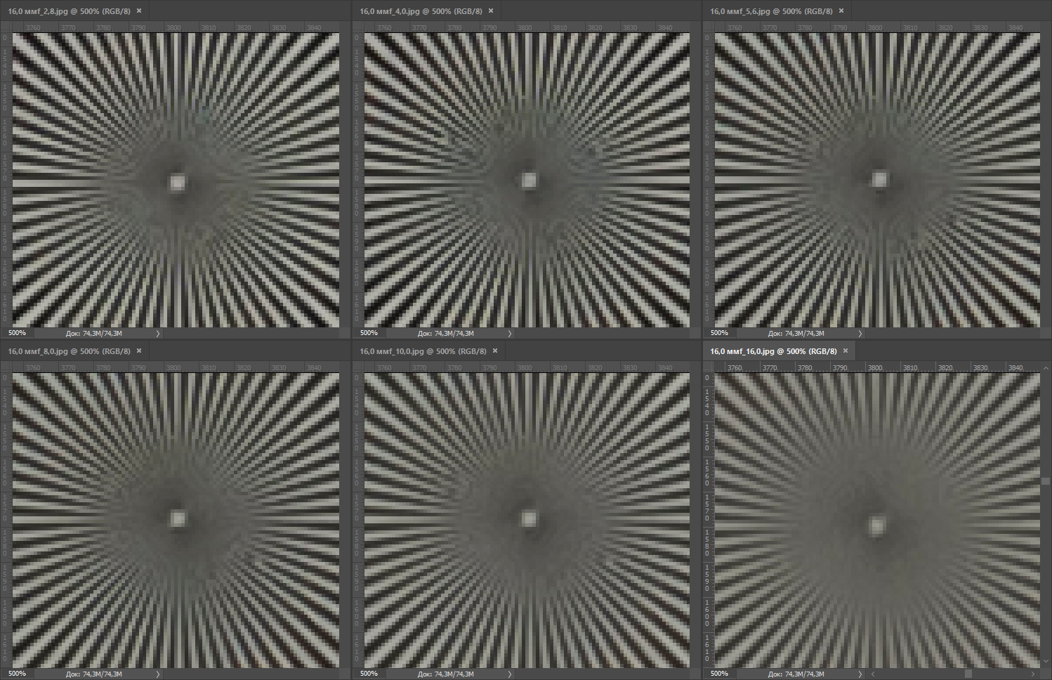 При всех значениях диафрагмы центральная резкость остается очень хорошей, а периферийная усиливается в ряду значений F2,8—F8 и в дальнейшем снижается при F16—F22 (очевидно, из-за дифракции).