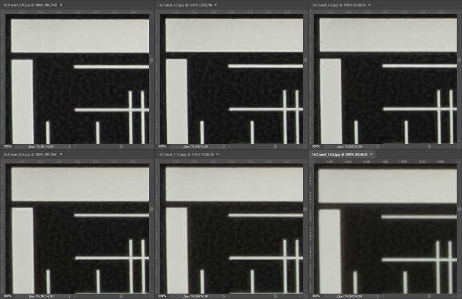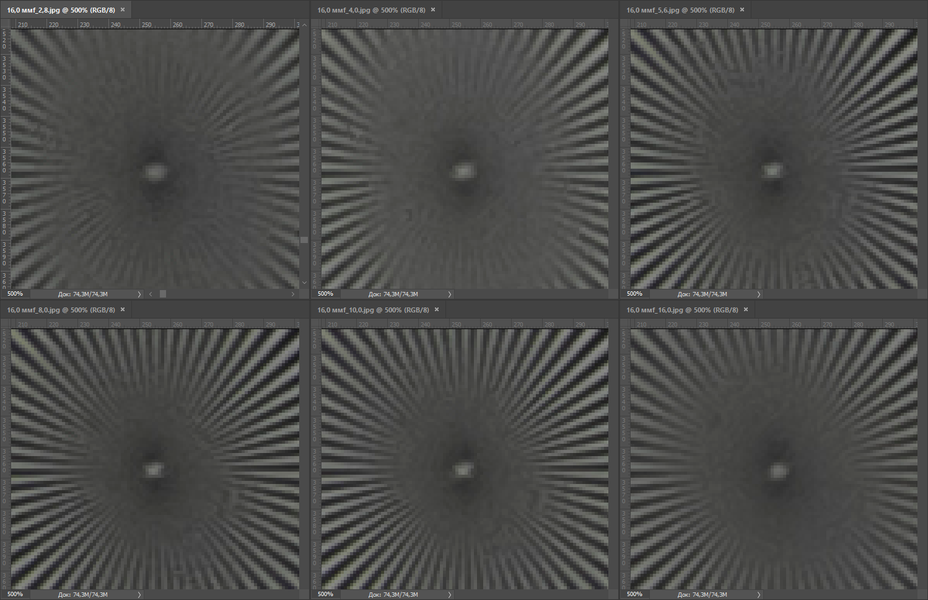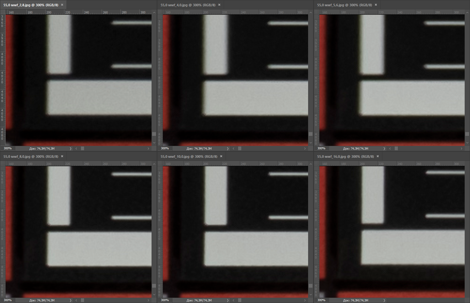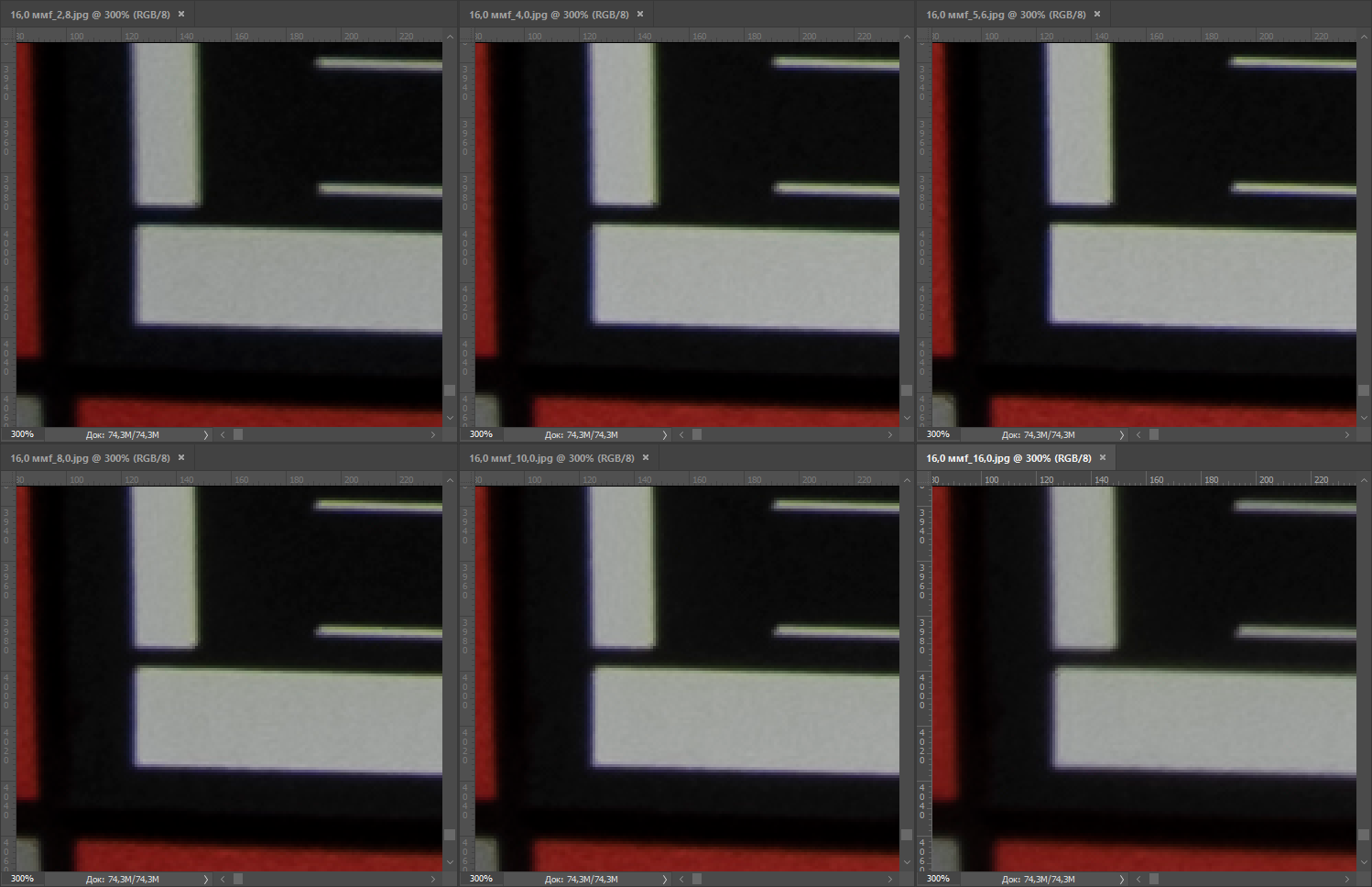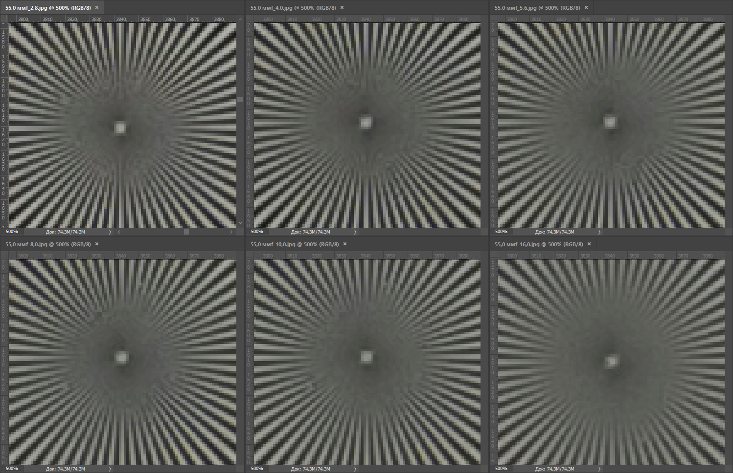 При всех значениях диафрагмы центральная резкость остается очень хорошей, а периферийная усиливается в ряду значений F2,8—F8 и в дальнейшем снижается при F16—F22 (очевидно, из-за дифракции).