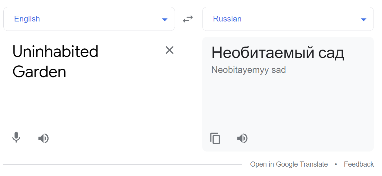 Кстати, новоиерусалимский перевод названия работы Байестера (англ. Uninhabited Garden) как «Нежилой сад» тоже не слишком удачен, и как раз в этом случае онлайн-переводчик оказывается более адекватным: