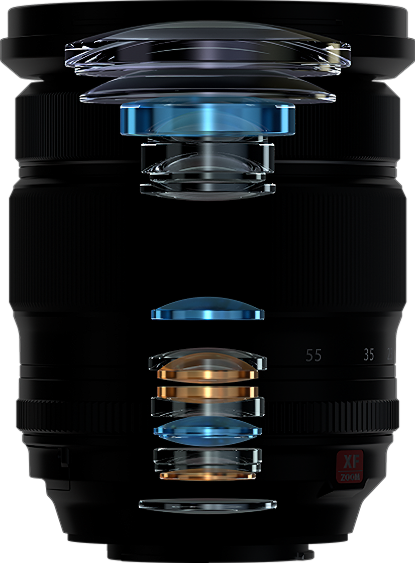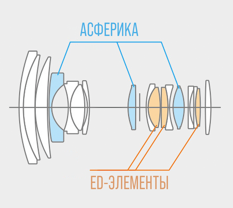 Среди них выделяются три асферические линзы и три элемента из стекла со сверхнизкими дисперсионными свойствами (Extra-low Dispersion, ED). Асферика позволяет эффективно бороться с неравномерностью преломления света в центре и на периферии поля зрения объектива, тем самым нивелируя сферические аберрации. ED-стекла дают возможность понизить разницу в рефрактивных свойствах среды для света разной длины волны — так уменьшаются хроматические аберрации. Общий итог использования элементов обоих типов состоит в повышении резкости и улучшении детализации изображения.