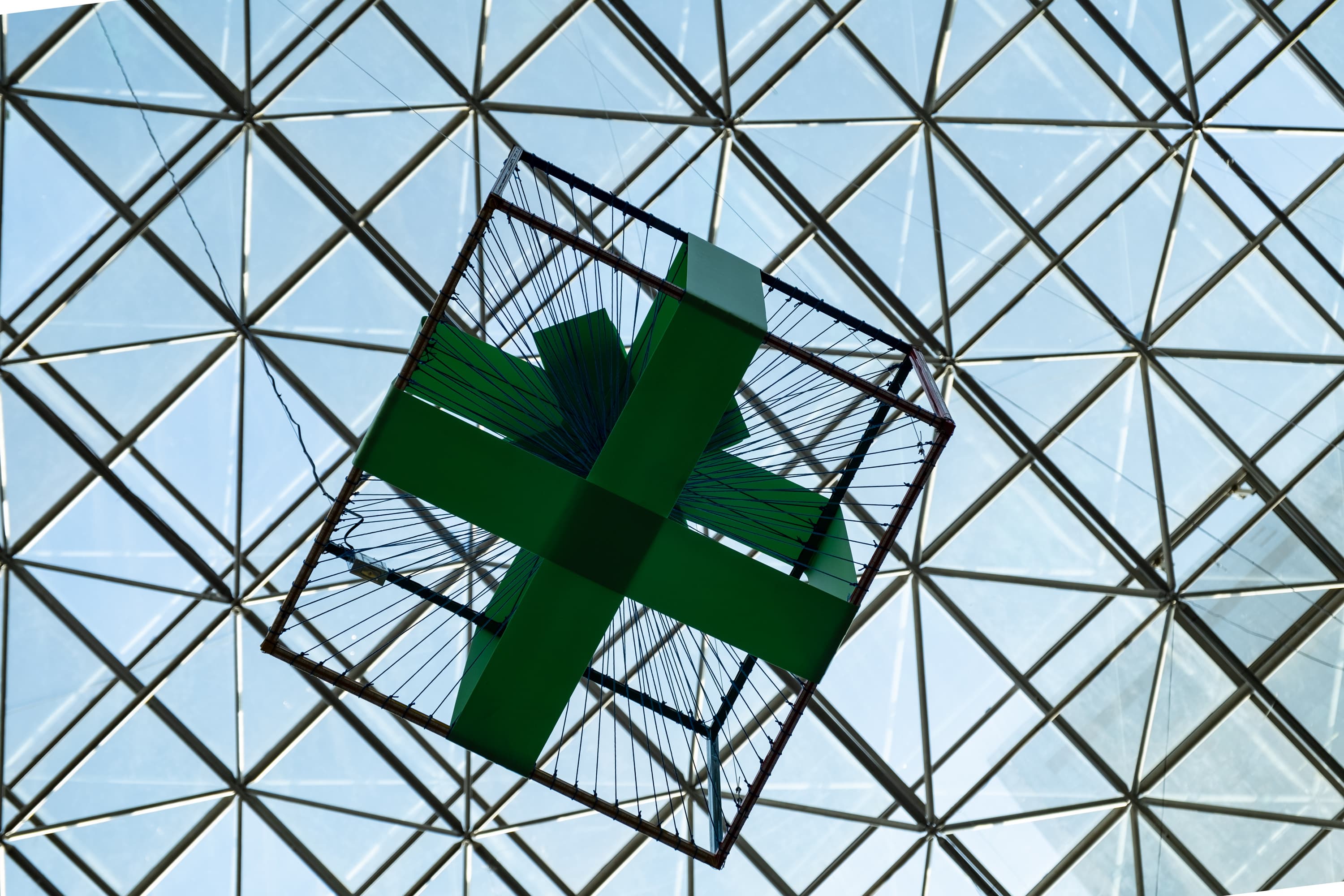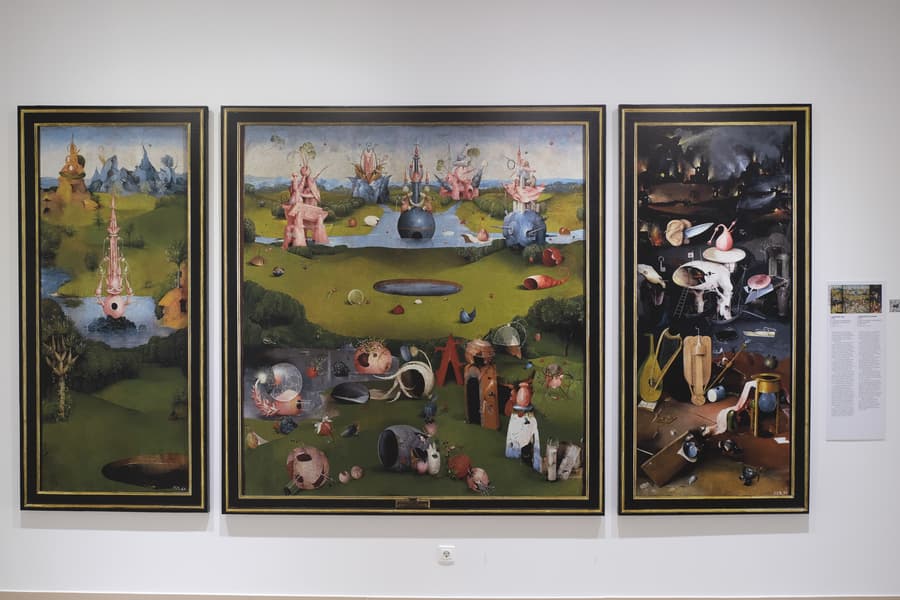 В ней тотчас узнаются три полотна Иеронима Босха «Сад радостей земных», только обезлюдевшие. (Мы приводим здесь и далее устоявшееся в искусствоведении русское название триптиха, а не вариант Google Translate, который предпочли организаторы выставки.)
